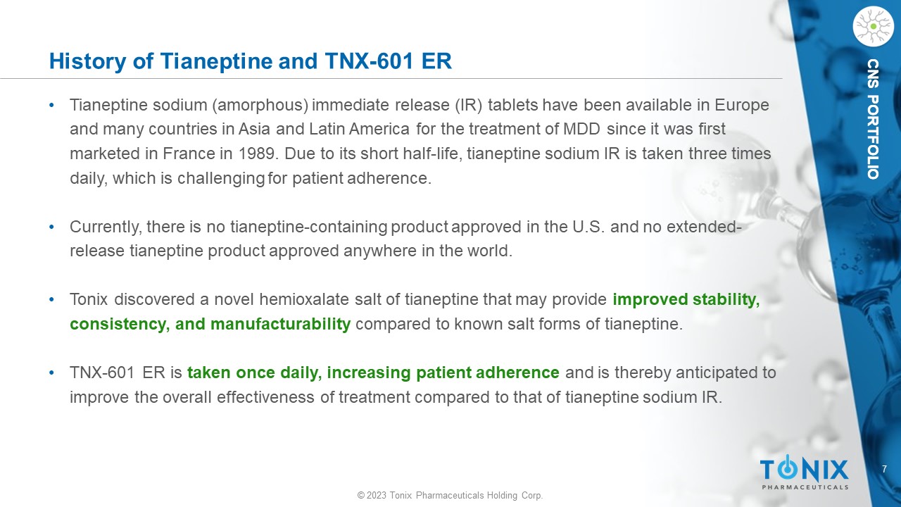 © 2023 Tonix Pharmaceuticals Holding Corp. 6 © 2023 Tonix Pharmaceuticals Holding Corp. CNS PORTFOLIO TNX - 601 ER - Phase 2 UPLIFT* Study Design General s tudy c haracteristics: • Randomized, double - blind, placebo - controlle d study in Major Depressive Disorder to evaluate monotherapy with TNX - 601 ER versus placebo • Parallel design with two arms – treatment with tianeptine hemioxalate 39.4 mg or placebo • ~30 U.S. sites only, expected to enroll approximately 300 patients • One unblinded interim analysis based on 50% of randomized participants expected 4Q’2 3 Primary Endpoint: • Mean change from baseline in the Montgomery - Åsberg Depression Rating Scale (MADRS) total score at W eek 6 *ClinicalTrials.gov Identifier: NCT05686408 Abbreviations: Dx, diagnosis; ER, extended - release; F/U, follow - up; MDD, major depressive disorder; MDE, major depressive episo de; N, number