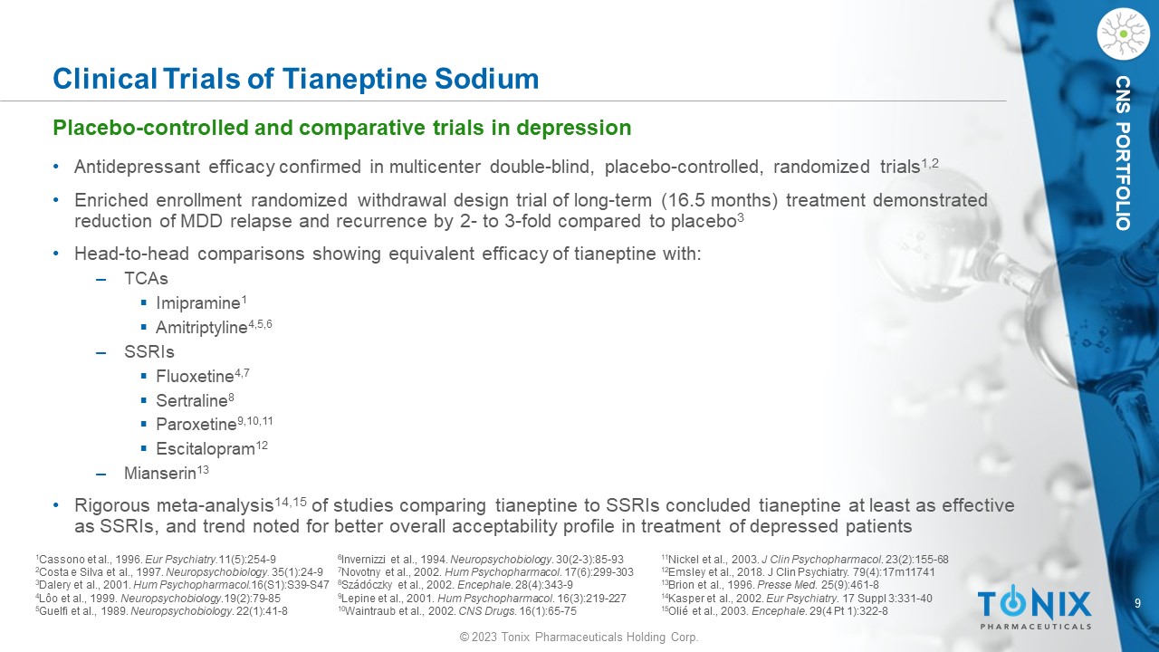 © 2023 Tonix Pharmaceuticals Holding Corp. 8 © 2023 Tonix Pharmaceuticals Holding Corp. CNS PORTFOLIO 1 Tartt et al., 2022. Molecular Psychiatry 27: 2689 – 2699. 2 Plaisant et al.,2003. Neuropharmacology 44: 801 – 809. 3 Slusarczyk et al., 2018. Int J Mol Sci 19: 1965. • In Table 1 (right), it is illustrated how downstream effects of AD actions on neuroplasticity, including enhanced neurogenesis, contribute to improvements in both mood and cognitive function • Tianeptine additionally has neuroprotective effects against hypoxia and deleterious effects of inflammatory cytokines in cortex and white matter 2 • Tianeptine additionally has partially protective effects on the changes in microglia viability/death evoked by lipopolysaccharide 3 • And >30 years of real - world experience with tianeptine for depression ex - US support its unique aspects, heretofore unavailable in US Proposed MOA of Tianeptine Distinct compared to other antidepressants currently marketed in the U.S.