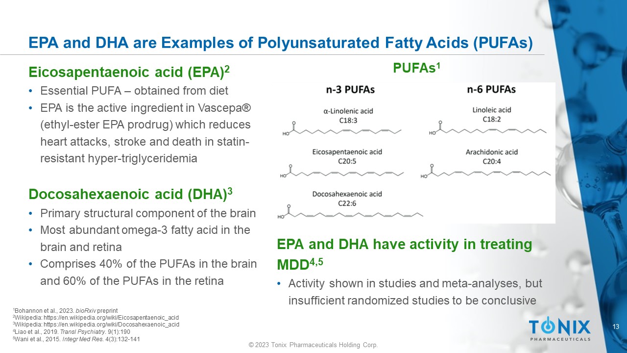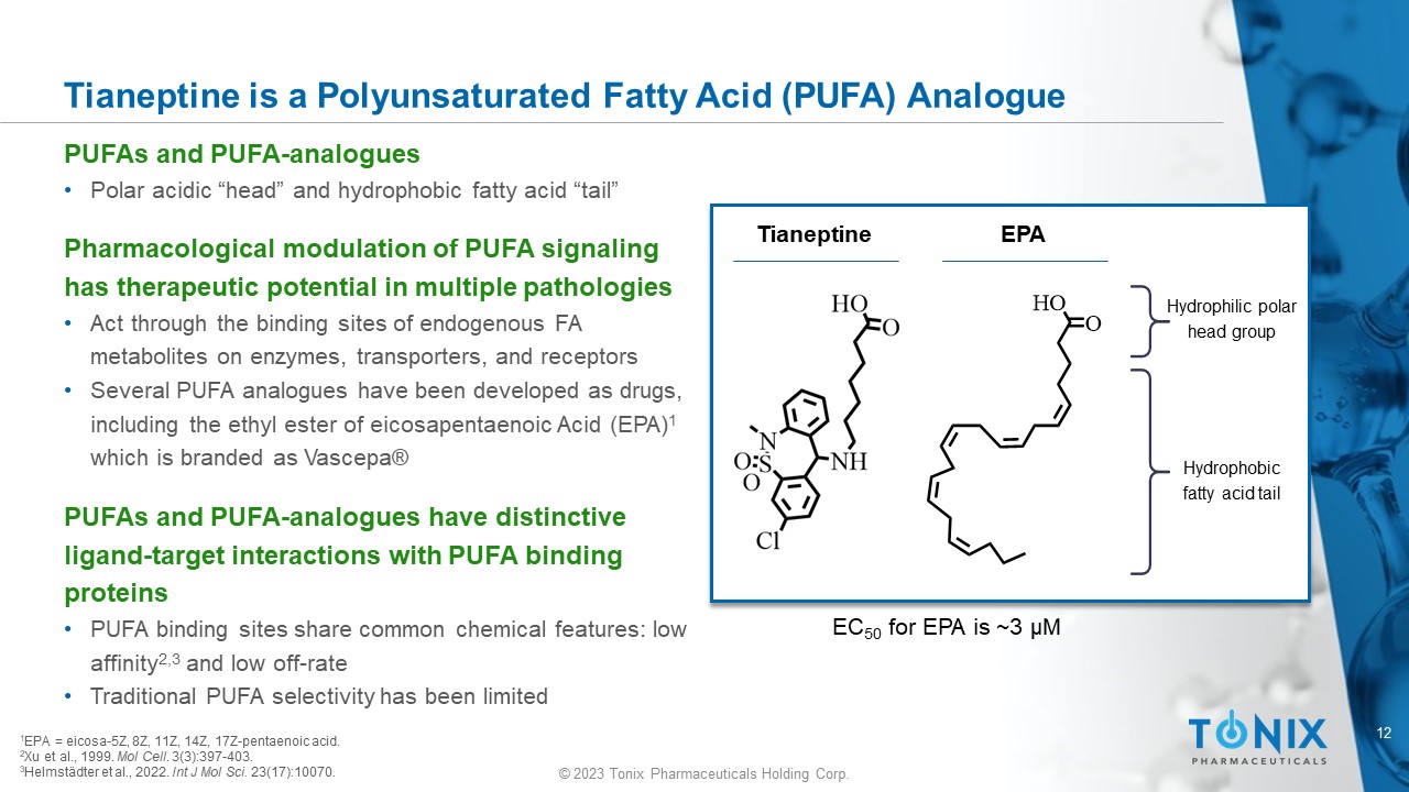 © 2023 Tonix Pharmaceuticals Holding Corp. 12 © 2023 Tonix Pharmaceuticals Holding Corp. Tianeptine is a Polyunsaturated Fatty Acid (PUFA) Analogue PUFAs and PUFA - analogues • Polar acidic “head” and hydrophobic fatty acid “tail” Pharmacological modulation of PUFA signaling has therapeutic potential in multiple pathologies • Act through the binding sites of endogenous FA metabolites on enzymes, transporters, and receptors • Several PUFA analogues have been developed as drugs, including the ethyl ester of eicosapentaenoic Acid (EPA) 1 which is branded as Vascepa ® PUFAs and PUFA - analogues have distinctive ligand - target interactions with PUFA binding proteins • PUFA binding sites share common chemical features: low affinity 2,3 and low off - rate • Traditional PUFA selectivity has been limited EPA Hydrophilic polar head group Hydrophobic fatty acid tail 1 EPA = e icosa - 5Z, 8Z, 11Z, 14Z, 17Z - pentaenoic acid. 2 Xu et al., 1999. Mol Cell . 3(3):397 - 403. 3 Helmstädter et al., 2022. Int J Mol Sci. 23(17):10070. Tianeptine EC 50 for EPA is ~3 µM