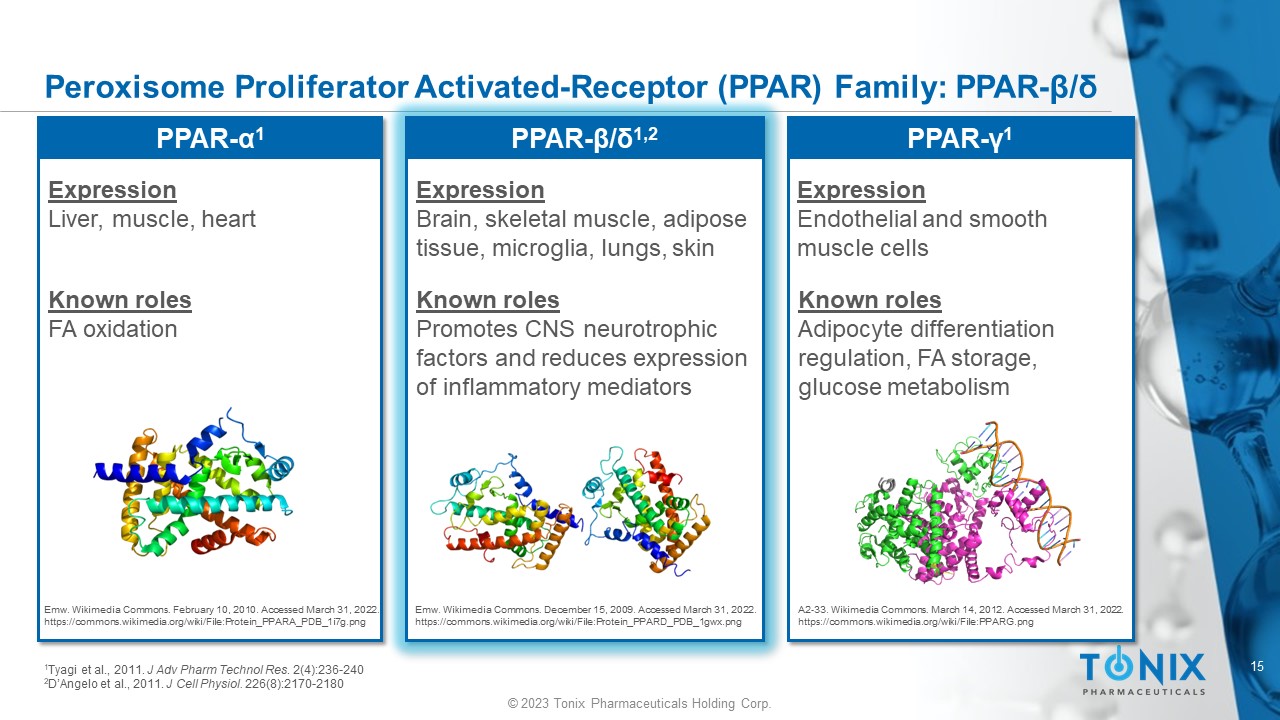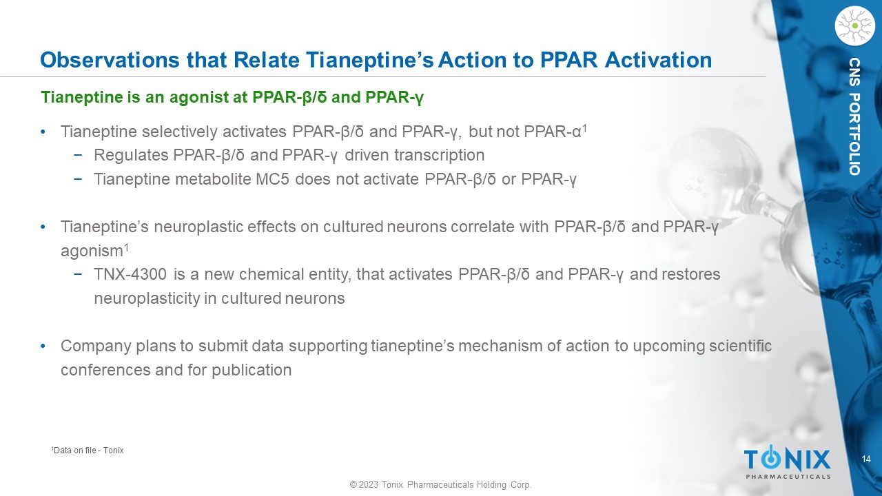 © 2023 Tonix Pharmaceuticals Holding Corp. 14 © 2023 Tonix Pharmaceuticals Holding Corp. CNS PORTFOLIO Observations that Relate Tianeptine’s Action to PPAR Activation • Tianeptine selectively activates PPAR - β / δ and PPAR - γ, but not PPAR - α 1 − Regulates PPAR - β / δ and PPAR - γ driven transcription − Tianeptine metabolite MC5 does not activate PPAR - β / δ or PPAR - γ • Tianeptine’s neuroplastic effects on cultured neurons correlate with PPAR - β / δ and PPAR - γ agonism 1 − TNX - 4300 is a new chemical entity, that activates PPAR - β / δ and PPAR - γ and restores neuroplasticity in cultured neurons • Company plans to submit data supporting tianeptine’s mechanism of action to upcoming scientific conferences and for publication 1 Data on file - Tonix Tianeptine is an agonist at PPAR - β / δ and PPAR - γ