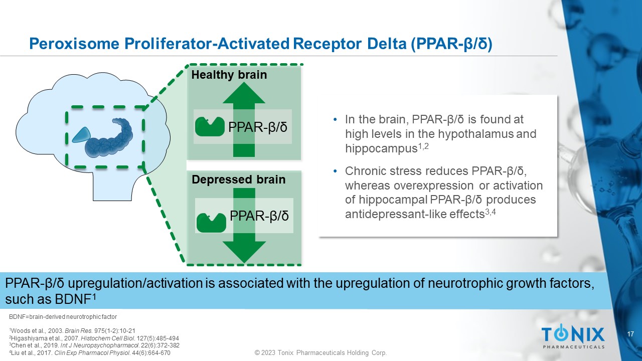 © 2023 Tonix Pharmaceuticals Holding Corp. 17 © 2023 Tonix Pharmaceuticals Holding Corp. Peroxisome Proliferator - Activated Receptor Delta (PPAR - β/δ) BDNF=brain - derived neurotrophic factor 1 Woods et al., 2003. Brain Res. 975(1 - 2):10 - 21 2 Higashiyama et al., 2007. Histochem Cell Biol . 127(5):485 - 494 3 Chen et al., 2019. Int J Neuropsychopharmacol . 22(6):372 - 382 4 Liu et al., 2017. Clin Exp Pharmacol Physiol. 44(6):664 - 670 • In the brain, PPAR - β/δ is found at high levels in the hypothalamus and hippocampus 1,2 • Chronic stress reduces PPAR - β/δ, whereas overexpression or activation of hippocampal PPAR - β/δ produces antidepressant - like effects 3,4 PPAR - β/δ upregulation/activation is associated with the upregulation of neurotrophic growth factors, such as BDNF 1 PPAR - β/δ Healthy brain PPAR - β/δ Depressed brain