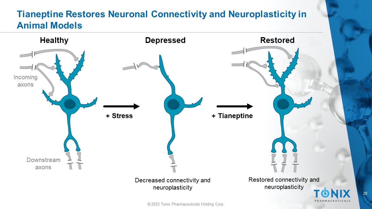 © 2023 Tonix Pharmaceuticals Holding Corp. 19 © 2023 Tonix Pharmaceuticals Holding Corp. Tianeptine Helps Restore Stress - Related Hippocampal Remodeling Tianeptine activation of PPAR - β / δ regulates the expression of genes that stimulate dendrite arborization and reduce proinflammatory microglia activation. By these activities, tianeptine is thought to treat depression at the neuroplastic and neurogenerative levels 1 - 4 Tianeptine administration reversed stress - induced dendrite shrinkage in hippocampal CA3 dendrites 3 Restored Healthy Tianeptine activation of PPAR - β/δ appears related to tianeptine’s known effect on reducing inflammation and encouraging neuronal growth and development 1,2 P Depressed Dendrites PPAR - β/δ RXR + Stress + Tianeptine Tianeptine normalizes CX3CL1 levels and polarizes microglia to M2 activation 4 Increased CX3CL1 levels Tianeptine M1 quiescent Neuroprotection Neuropathology M2 polarization 1 Ji et al., 2015. Int J Neuropsychopharmacol . 19(1):pyv083 2 Liu et al., 2017. Clin Exp Pharmacol Physiol. 44(6):664 - 670 3 Magariños et al., 1999. Eur J Pharmacol . 371(2 - 3):113 - 122 4 Trojan et al., 2017. Front Pharmacol . 8:779