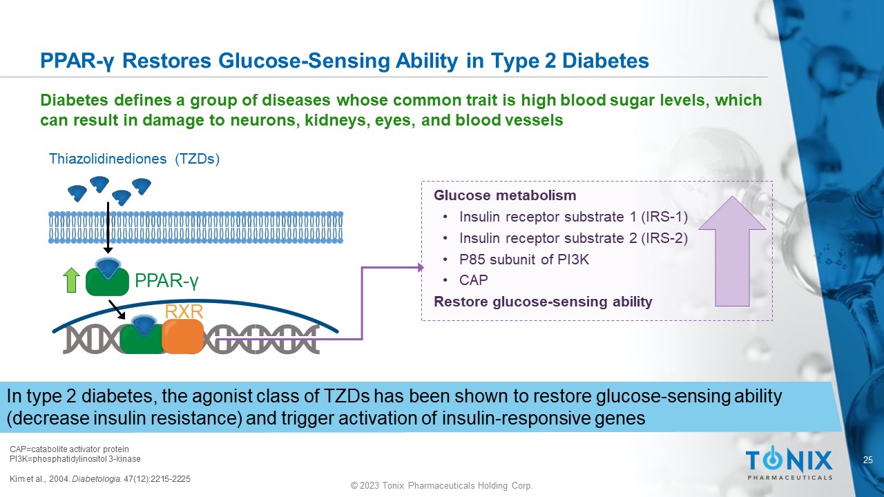 © 2023 Tonix Pharmaceuticals Holding Corp. 24 © 2023 Tonix Pharmaceuticals Holding Corp. PPAR Family Members: PPAR - γ Emw . Wikimedia Commons . February 10, 2010. Accessed March 31, 2022. https://commons.wikimedia.org/wiki/File:Protein_PPARA_PDB_1i7g.png Emw . Wikimedia Commons . December 15, 2009. Accessed March 31, 2022. https://commons.wikimedia.org/wiki/File:Protein_PPARD_PDB_1gwx.png A2 - 33. Wikimedia Commons . March 14, 2012. Accessed March 31, 2022. https://commons.wikimedia.org/wiki/File:PPARG.png Expression Liver, muscle, heart Known roles FA oxidation Expression Brain, skeletal muscle, adipose tissue, microglia, lungs, skin Known roles Promotes CNS neurotrophic factors and reduces expression of inflammatory mediators Expression Endothelial and smooth muscle cells Known roles Adipocyte differentiation regulation, FA storage, glucose metabolism PPAR - α 1 PPAR - β/δ 1,2 PPAR - γ 1 1 Tyagi et al., 2011. J Adv Pharm Technol Res . 2(4):236 - 240 2 D’Angelo et al., 2011. J Cell Physiol. 226(8):2170 - 2180