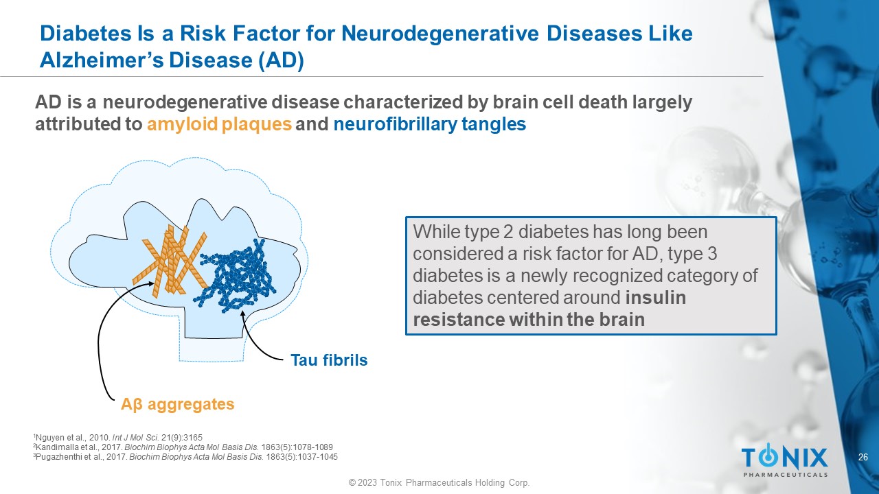 © 2023 Tonix Pharmaceuticals Holding Corp. 25 © 2023 Tonix Pharmaceuticals Holding Corp. Glucose metabolism • Insulin receptor substrate 1 (IRS - 1) • Insulin receptor substrate 2 (IRS - 2) • P85 subunit of PI3K • CAP Restore glucose - sensing ability PPAR - γ Restores Glucose - Sensing Ability in Type 2 Diabetes CAP=catabolite activator protein PI3K=phosphatidylinositol 3 - kinase Kim et al., 2004. Diabetologia . 47(12):2215 - 2225 Diabetes defines a group of diseases whose common trait is high blood sugar levels, which can result in damage to neurons, kidneys, eyes, and blood vessels In type 2 diabetes, the agonist class of TZDs has been shown to restore glucose - sensing ability (decrease insulin resistance) and trigger activation of insulin - responsive genes PPAR - γ RXR Thiazolidinediones ( TZDs )