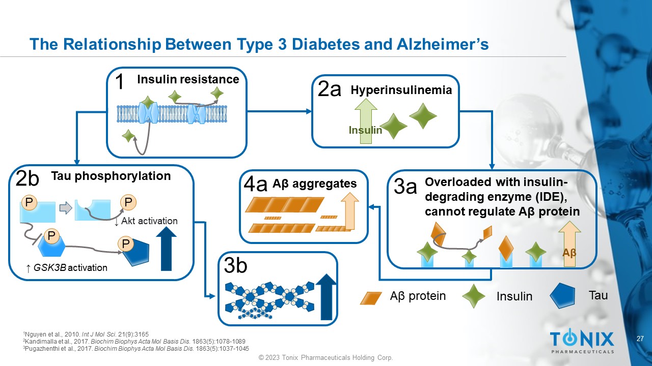 © 2023 Tonix Pharmaceuticals Holding Corp. 27 © 2023 Tonix Pharmaceuticals Holding Corp. The Relationship Between Type 3 Diabetes and Alzheimer’s 3b ↑ GSK3B activation P P P P Tau phosphorylation ↓ Akt activation 2b 4a Insulin A β protein Tau Overloaded with insulin - degrading enzyme (IDE), cannot regulate A β protein A β 3a Hyperinsulinemia Insulin 2a Insulin resistance 1 A β aggregates 1 Nguyen et al., 2010. Int J Mol Sci. 21(9):3165 2 Kandimalla et al., 2017. Biochim Biophys Acta Mol Basis Dis. 1863(5):1078 - 1089 3 Pugazhenthi et al., 2017. Biochim Biophys Acta Mol Basis Dis. 1863(5):1037 - 1045