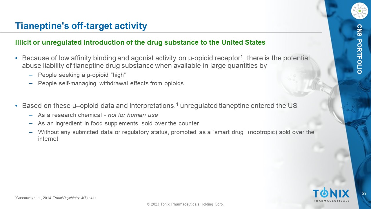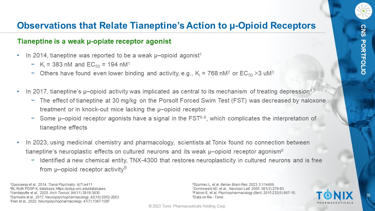 © 2023 Tonix Pharmaceuticals Holding Corp. 29 © 2023 Tonix Pharmaceuticals Holding Corp. CNS PORTFOLIO Tianeptine's off - target activity • Because of low affinity binding and agonist activity on µ - opioid receptor 1 , there is the potential abuse liability of tianeptine drug substance when available in large quantities by ‒ People seeking a µ - opioid “high” ‒ People self - managing withdrawal effects from opioids • Based on these µ – opioid data and interpretations, 1 unregulated tianeptine entered the US ‒ As a research chemical - not for human use ‒ As an ingredient in food supplements sold over the counter ‒ Without any submitted data or regulatory status, promoted as a “smart drug” (nootropic) sold over the internet Illicit or unregulated introduction of the drug substance to the United States 1 Gassaway et al., 2014. Transl Psychiatry . 4(7):e411