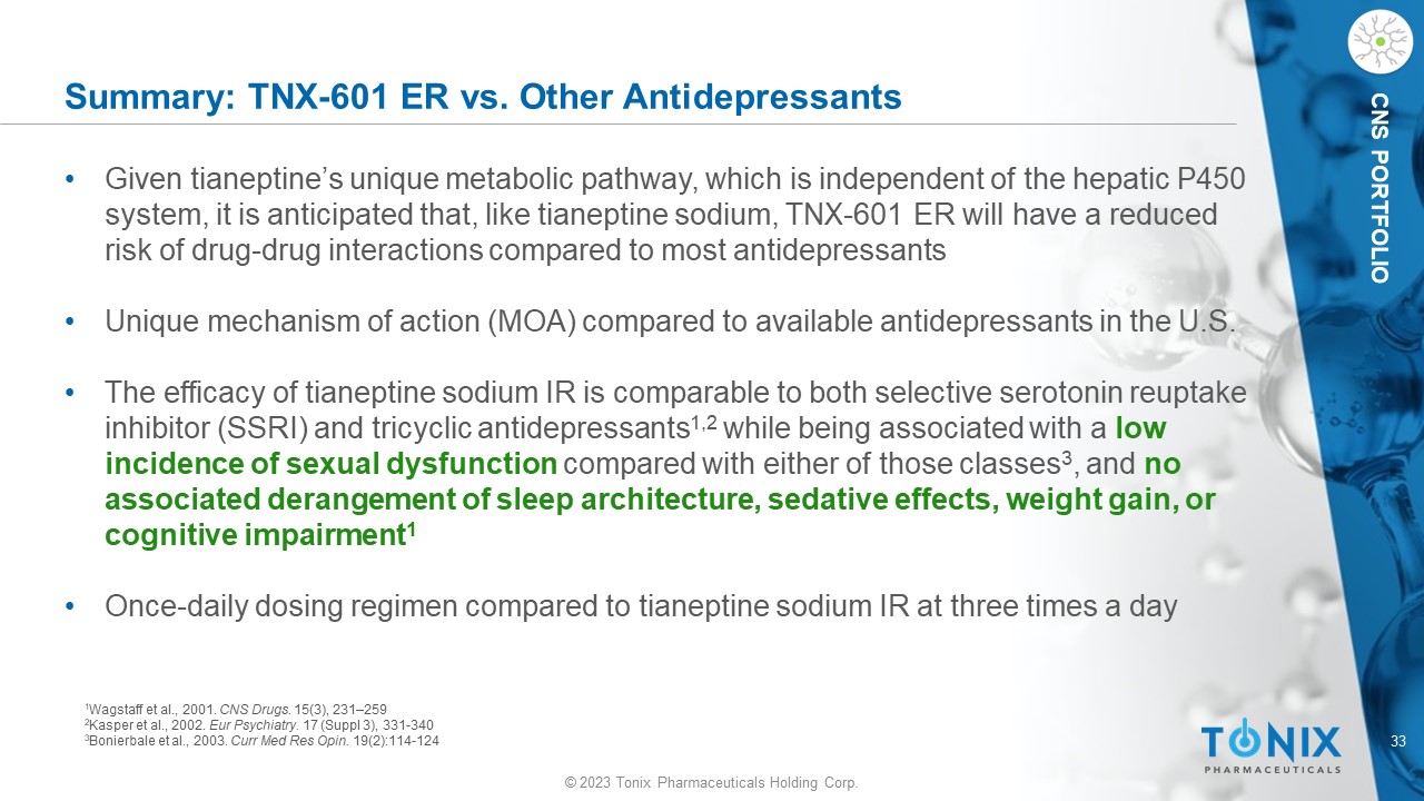© 2023 Tonix Pharmaceuticals Holding Corp. 32 © 2023 Tonix Pharmaceuticals Holding Corp. CNS PORTFOLIO TNX - 601 ER Drug product • The only abuse - deterrent properties approved for the labels of certain marketed opioids are extended - release formulations with physiochemical barriers +/ - aversive components to abuse • TNX - 601 ER was formulated with attention to these potentially abuse deterrent properties: ‒ Active ingredient, tianeptine oxalate less soluble than sodium salt, reducing extraction efficiency in solvents such as water and alcohol ‒ Microcrystalline cellulose is a compression aid that results in extremely hard tablets, reducing ability to crush to fine particulate matter for insufflation or efficient extraction, pressed at >100 Newtons ‒ Inclusion of high molecular weight gel - forming polymers also adversely affects the “syringe - ability” and injectability of the drug product ‒ Inclusion of hydrophilic fumed silica as well as magnesium stearate may cause nasal irritation if insufflated; in high doses, orally ingested magnesium stearate may cause GI hyperactivity and irritation ‒ All potentially serve to make TNX - 601 ER a non - optimal source of tianeptine for high dose abuse TNX - 601 ER formulated with attention to FDA - guided potential abuse deterrent properties* *https://www.fda.gov/drugs/information - drug - class/final - guidance - evaluation - and - labeling - abuse - deterrent - opioids
