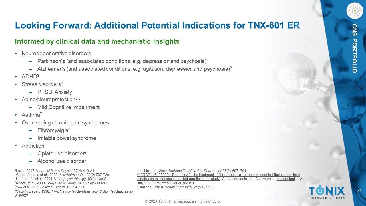 © 2023 Tonix Pharmaceuticals Holding Corp. 33 © 2023 Tonix Pharmaceuticals Holding Corp. CNS PORTFOLIO Summary: TNX - 601 ER vs. Other Antidepressants • Given tianeptine’s unique metabolic pathway, which is independent of the hepatic P450 system, it is anticipated that, like tianeptine sodium, TNX - 601 ER will have a reduced risk of drug - drug interactions compared to most antidepressants • Unique mechanism of action (MOA) compared to available antidepressants in the U.S. • The efficacy of tianeptine sodium IR is comparable to both selective serotonin reuptake inhibitor (SSRI) and tricyclic antidepressants 1,2 while being associated with a low incidence of sexual dysfunction compared with either of those classes 3 , and no associated derangement of sleep architecture, sedative effects, weight gain, or cognitive impairment 1 • Once - daily dosing regimen compared to tianeptine sodium IR at three times a day 1 Wagstaff et al., 2001. CNS Drugs . 15(3), 231 – 259 2 Kasper et al., 2002. Eur Psychiatry. 17 (Suppl 3), 331 - 340 3 Bonierbale et al., 2003. Curr Med Res Opin . 19(2):114 - 124