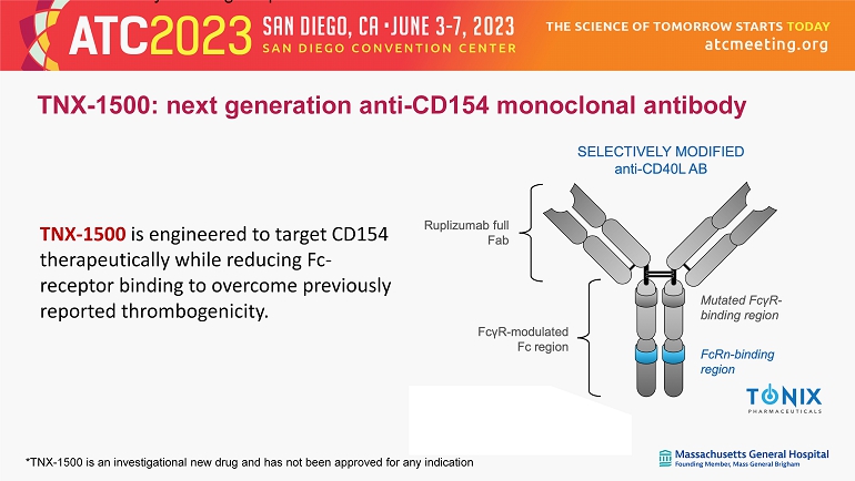 *TNX - 1500 is an investigational new drug and has not been approved for any indication thereby lowering the potential for thrombosis. TNX - 1500: next generation anti - CD154 monoclonal antibody TNX - 1500 is engineered to target CD154 therapeutically while reducing Fc - receptor binding to overcome previously reported thrombogenicity.