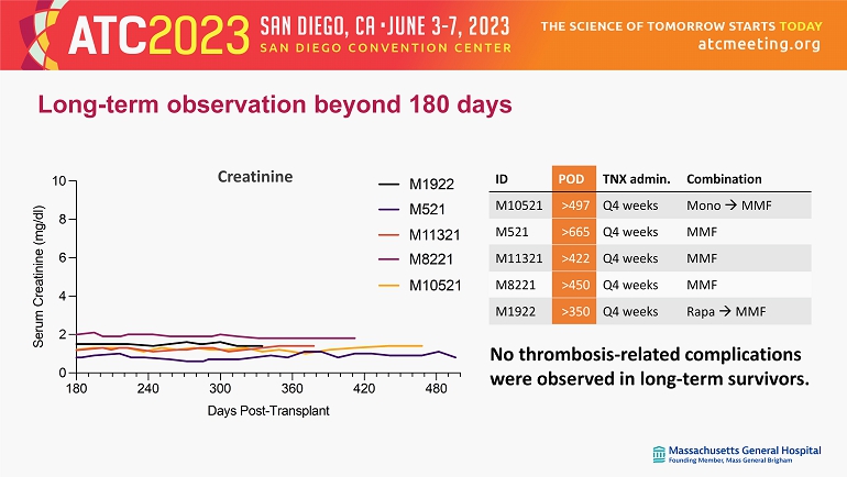 Long - term observation beyond 180 days Combination TNX admin. POD ID Mono  MMF Q4 weeks >497 M10521 MMF Q4 weeks >665 M521 MMF Q4 weeks >422 M11321 MMF Q4 weeks >450 M8221 Rapa  MMF Q4 weeks >350 M1922 180 240 300 360 420 480 0 2 4 6 8 10 Days Post-Transplant S e r u m C r e a t i n i n e ( m g / d l ) M1922 M521 M8221 M11321 M10521 180 240 300 360 420 480 0 2 4 6 8 10 Days Post-Transplant S e r u m C r e a t i n i n e ( m g / d l ) M1922 M521 M8221 M11321 M10521 No thrombosis - related complications were observed in long - term survivors. Creatinine