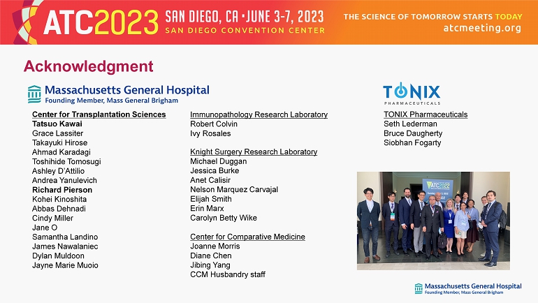 Center for Transplantation Sciences Tatsuo Kawai Grace Lassiter Takayuki Hirose Ahmad Karadagi Toshihide Tomosugi Ashley D’Attilio Andrea Yanulevich Richard Pierson Kohei Kinoshita Abbas Dehnadi Cindy Miller Jane O Samantha Landino James Nawalaniec Dylan Muldoon Jayne Marie Muoio Knight Surgery Research Laboratory Michael Duggan Jessica Burke Anet Calisir Nelson Marquez Carvajal Elijah Smith Erin Marx Carolyn Betty Wike Immunopathology Research Laboratory Robert Colvin Ivy Rosales TONIX Pharmaceuticals Seth Lederman Bruce Daugherty Siobhan Fogarty Center for Comparative Medicine Joanne Morris Diane Chen Jibing Yang CCM Husbandry staff Acknowledgment