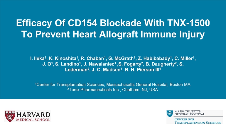 Efficacy Of CD154 Blockade With TNX - 1500 To Prevent Heart Allograft Immune Injury I. Ileka 1 , K. Kinoshita 1 , R. Chaban 1 , G. McGrath 1 , Z. Habibabady 1 , C. Miller 1 , J. O 1 , S. Landino 1 , J. Nawalaniec 1 ,S. Fogarty 2 , B. Daugherty 2 , S. Lederman 2 , J. C. Madsen 1 , R. N. Pierson III 1 1 Center for Transplantation Sciences, Massachusetts General Hospital, Boston MA 2 Tonix Pharmaceuticals Inc., Chatham, NJ, USA