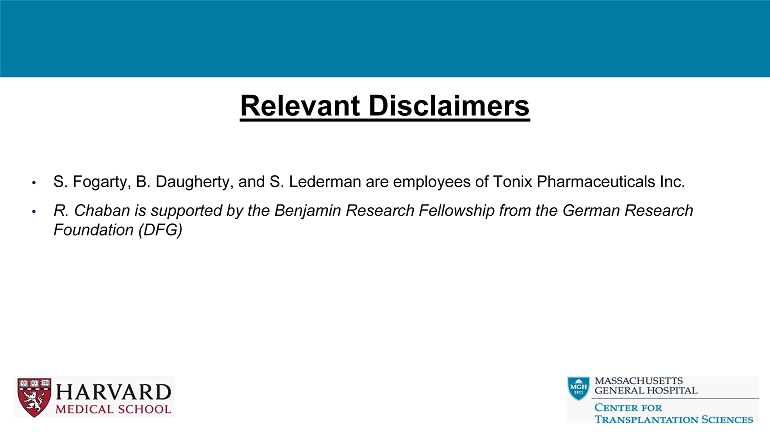 Relevant Disclaimers • S. Fogarty, B. Daugherty, and S. Lederman are employees of Tonix Pharmaceuticals Inc. • R. Chaban is supported by the Benjamin Research Fellowship from the German Research Foundation (DFG)