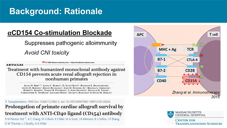 Background: Rationale α CD154 Co - stimulation Blockade Suppresses pathogenic alloimmunity Avoid CNI toxicity Zhang et al. Immunotherapy 2015 MHC + Ag TCR B7 - 1 CTLA - 4 B7 - 2 CD28 CD40 CD154 APC T cell