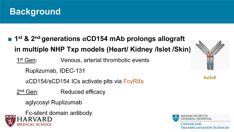 ■ 1 st & 2 nd generations α CD154 mAb prolongs allograft in multiple NHP Txp models (Heart/ Kidney /Islet /Skin) 1 st Gen : Venous, arterial thrombotic events Ruplizumab, IDEC - 131 α CD154/sCD154 ICs activate plts via FcγRIIa 2 nd Gen : Reduced efficacy aglycosyl Ruplizumab Fc - silent domain antibody hu5c8 Background