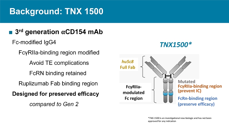 Fc - modified IgG4 FcγRIIa - binding region modified Avoid TE complications FcRN binding retained Ruplizumab Fab binding region Designed for preserved efficacy compared to Gen 2 TNX1500* hu5c8 Full Fab FcγRIIa - modulated Fc region Mutated FcγRIIa - binding region (prevent IC) FcRn - binding region (preserve efficacy) *TNX - 1500 is an investigational new biologic and has not been approved for any indication ■ 3 rd generation α CD154 mAb Background: TNX 1500