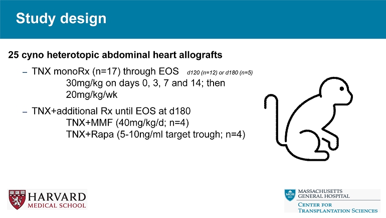 Study design 25 cyno heterotopic abdominal heart allografts – TNX monoRx (n=17) through EOS d120 (n=12) or d180 (n=5) 30mg/kg on days 0, 3, 7 and 14; then 20mg/kg/wk – TNX+additional Rx until EOS at d180 TNX+MMF (40mg/kg/d; n=4) TNX+Rapa (5 - 10ng/ml target trough; n=4)