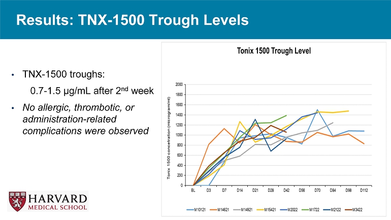 Results: TNX - 1500 Trough Levels • TNX - 1500 troughs: 0.7 - 1.5 µg/mL after 2 nd week • No allergic, thrombotic, or administration - related complications were observed