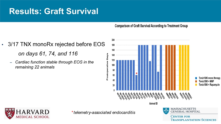 Results: Graft Survival • 3/17 TNX monoRx rejected before EOS on days 61, 74, and 116 – Cardiac function stable through EOS in the remaining 22 animals * telemetry - associated endocarditis *