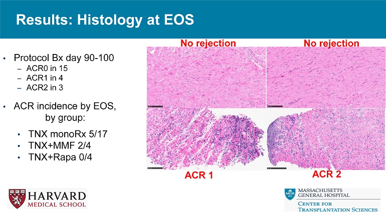 Results: Histology at EOS • Protocol Bx day 90 - 100 – ACR0 in 15 – ACR1 in 4 – ACR2 in 3 • ACR incidence by EOS, by group: • TNX monoRx 5/17 • TNX+MMF 2/4 • TNX+Rapa 0/4 ACR 1 ACR 2 No rejection No rejection