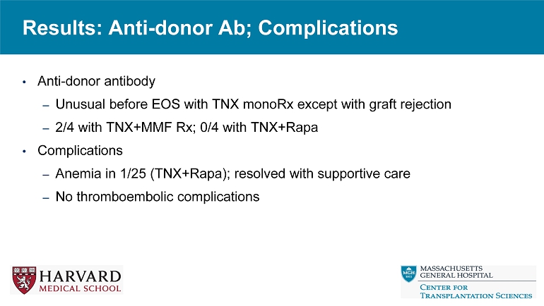 • Anti - donor antibody – Unusual before EOS with TNX monoRx except with graft rejection – 2/4 with TNX+MMF Rx; 0/4 with TNX+Rapa • Complications – Anemia in 1/25 (TNX+Rapa); resolved with supportive care – No thromboembolic complications Results: Anti - donor Ab; Complications