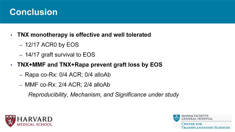 • TNX monotherapy is effective and well tolerated – 12/17 ACR0 by EOS – 14/17 graft survival to EOS • TNX+MMF and TNX+Rapa prevent graft loss by EOS – Rapa co - Rx: 0/4 ACR; 0/4 alloAb – MMF co - Rx: 2/4 ACR; 2/4 alloAb Reproducibility, Mechanism, and Significance under study Conclusion