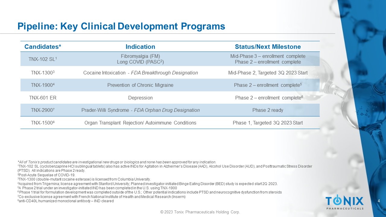 3 © 2023 Tonix Pharmaceuticals Holding Corp. Investment Highlights RICH PIPELINE OF THERAPEUTICS CANDIDATES IN DEVELOPMENT Tonix’s core focus is on central nervous system disorders, but we also target unmet needs across multiple therapeutic areas including immunology, infectious disease and rare disease. STRATEGIC PARTNERSHIPS Partnering strategically with other biotech companies , world - class academic and non - profit research organizations to bring innovative therapeutics to market faster. IN - HOUSE CAPABILITIES I nternal capabilities in R&D and biologics process development and GMP manufacturing to accelerate development timelines. MARKETED PRODUCTS Tonix Medicines markets two FDA - approved products Zembrace ® SymTouch ® (sumatriptan injection) and Tosymra ® (sumatriptan nasal spray) for the treatment of acute migraine in adults with or without aura 1 Zembrace SymTouch [package insert] . Maple Grove, MN : Upsher - Smith Laboratories, LLC : February 2021 - For more information, talk to your provider and read the Patient Information and Instructions for Use . – Important Safety Information is provided in the appendix 2 Tosymra [package insert]. Maple Grove, MN: Upsher - Smith Laboratories, LLC: Feb 2021 . For more information, talk to your provider and read the Patient Information and Instructions for Use . – Important Safety Information is provided in the appendix Tonix has contracted to acquire the Zembrace , SymTouch and Tosymra trademarks. Intravail is a registered trademark of Aegis Therapeutics, LLC, a wholly owned subsidiary of Neurelis , Inc.