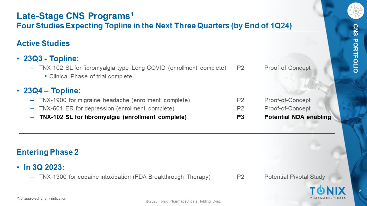 4 © 2023 Tonix Pharmaceuticals Holding Corp. Pipeline: Key Clinical Development Programs Candidates* Indication Status/Next Milestone TNX - 102 SL 1 Fibromyalgia (FM) Long COVID (PASC 2 ) Mid - Phase 3 – enrollment complete Phase 2 – enrollment complete TNX - 1300 3 Cocaine Intoxication - FDA Breakthrough Designation Mid - Phase 2, Targeted 3Q 2023 Start TNX - 1900 4 Prevention of Chronic Migraine Phase 2 – enrollment complete 5 TNX - 601 ER Depression Phase 2 – enrollment complete 6 TNX - 2900 7 Prader - Willi Syndrome - FDA Orphan Drug Designation Phase 2 ready TNX - 1500 8 Organ Transplant Rejection/ Autoimmune Conditions Phase 1, Targeted 3Q 2023 Start *All of Tonix’s product candidates are investigational new drugs or biologics and none has been approved for any indication. 1 TNX - 102 SL (cyclobenzaprine HCl sublingual tablets) also has active INDs for Agitation in Alzheimer’s Disease (AAD), Alcohol Use Disorder (AUD), and Posttraumatic Stress Disorder (PTSD). All indications are Phase 2 ready. 2 Post - Acute Sequelae of COVID - 19. 3 TNX - 1300 (double - mutant cocaine esterase) is licensed from Columbia University . 4 Acquired from Trigemina ; license agreement with Stanford University; Planned investigator - initiated Binge Eating Disorder (BED) study is expected start 2Q 2023. 5 A Phase 2 trial under an investigator - initiated IND has been completed in the U.S. using TNX - 1900 6 Phase 1 trial for formulation development was completed outside of the U.S.; Other potential indications include PTSD and neu roc ognitive d ysfunction from steroids 7 Co - exclusive license agreement with French National Institute of Health and Medical Research ( Inserm ) 8 anti - CD40L humanized monoclonal antibody – IND cleared