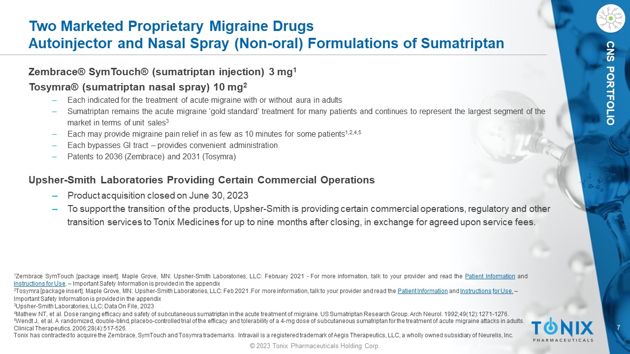 44 © 2023 Tonix Pharmaceuticals Holding Corp. CNS PORTFOLIO Zembrace ® IMPORTANT SAFETY INFORMATION (1 of 2) Zembrace SymTouch ( Zembrace ) can cause serious side effects, including heart attack and other heart problems, which may lead to death. Stop use and get emergency help if you have any signs of a heart attack:  D iscomfort in the center of your chest that lasts for more than a few minutes or goes away and comes back; severe tightness, pain, pressure, or heaviness in your chest, throat, neck, or jaw; pain or discomfort in your arms, back, neck, jaw or stomach ; shortness of breath with or without chest discomfort ; breaking out in a cold sweat ; nausea or vomiting ; feeling lightheaded Zembrace is not for people with risk factors for heart disease (high blood pressure or cholesterol, smoking, overweight, diabetes, family history of heart disease) unless a heart exam shows no problem. Do not use Zembrace if you have:  H istory of heart problems ; narrowing of blood vessels to your legs, arms, stomach, or kidney (peripheral vascular disease) ; uncontrolled high blood pressure ; hemiplegic or basilar migraines. If you are not sure if you have these, ask your provider.  H ad a stroke, transient ischemic attacks (TIAs), or problems with blood circulation ; severe liver problems ; taken any of the following medicines in the last 24 hours: almotriptan , eletriptan , frovatriptan , naratriptan, rizatriptan, ergotamines , dihydroergotamine ; are taking certain antidepressants, known as monoamine oxidase (MAO) - A inhibitors or it has been 2 weeks or less since you stopped taking a MAO - A inhibitor. Ask your provider for a list of these medicines if you are not sure.  A n allergy to sumatriptan or any of the components of Zembrace Tell your provider about all of your medical conditions and medicines you take, including vitamins and supplements. Zembrace can cause dizziness, weakness, or drowsiness. If so, do not drive a car, use machinery, or do anything where you need to be alert.