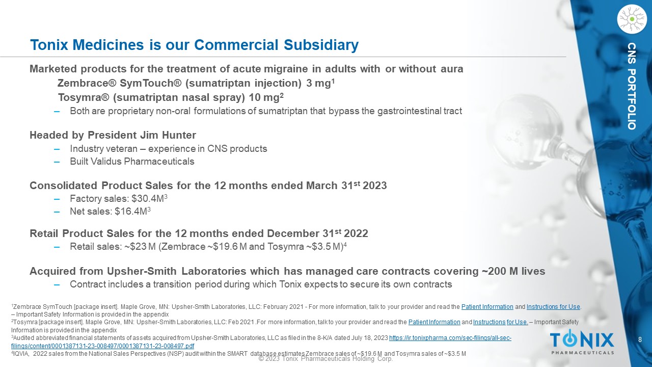 7 © 2023 Tonix Pharmaceuticals Holding Corp. CNS PORTFOLIO Two Marketed Proprietary Migraine Drugs Autoinjector and Nasal Spray (Non - oral) Formulations of Sumatriptan Zembrace ® SymTouch ® (sumatriptan injection) 3 mg 1 Tosymra ® (sumatriptan nasal spray) 10 mg 2 ‒ Each indicated for the treatment of acute migraine with or without aura in adults ‒ Sumatriptan remains the acute migraine ‘gold standard’ treatment for many patients and continues to represent the largest seg men t of the market in terms of unit sales 3 ‒ Each may provide migraine pain relief in as few as 10 minutes for some patients 1,2,4,5 ‒ Each bypasses GI tract – provides c onvenient administration ‒ Patents to 2036 ( Zembrace ) and 2031 ( Tosymra ) Upsher - Smith Laboratories Providing Certain Commercial Operations ‒ Product acquisition closed on June 30, 2023 ‒ To support the transition of the products, Upsher - Smith is providing certain commercial operations, regulatory and other transition services to Tonix Medicines for up to nine months after closing, in exchange for agreed upon service fees. 1 Zembrace SymTouch [package insert] . Maple Grove, MN : Upsher - Smith Laboratories, LLC : February 2021 - For more information, talk to your provider and read the Patient Information and Instructions for Use . – Important Safety Information is provided in the appendix 2 Tosymra [package insert]. Maple Grove, MN: Upsher - Smith Laboratories, LLC: Feb 2021 . For more information, talk to your provider and read the Patient Information and Instructions for Use. – Important Safety Information is provided in the appendix 3 Upsher - Smith Laboratories, LLC; Data On File, 2023 4 Mathew NT, et al. Dose ranging efficacy and safety of subcutaneous sumatriptan in the acute treatment of migraine. US Sumatri pta n Research Group. Arch Neurol. 1992;49(12):1271 - 1276. 5 Wendt J, et al. A randomized, double - blind, placebo - controlled trial of the efficacy and tolerability of a 4 - mg dose of subcutan eous sumatriptan for the treatment of acute migraine attacks in adults. Clinical Therapeutics. 2006;28(4):517 - 526. Tonix has contracted to acquire the Zembrace , SymTouch and Tosymra trademarks. Intravail is a registered trademark of Aegis Therapeutics, LLC, a wholly owned subsidiary of Neurelis , Inc.