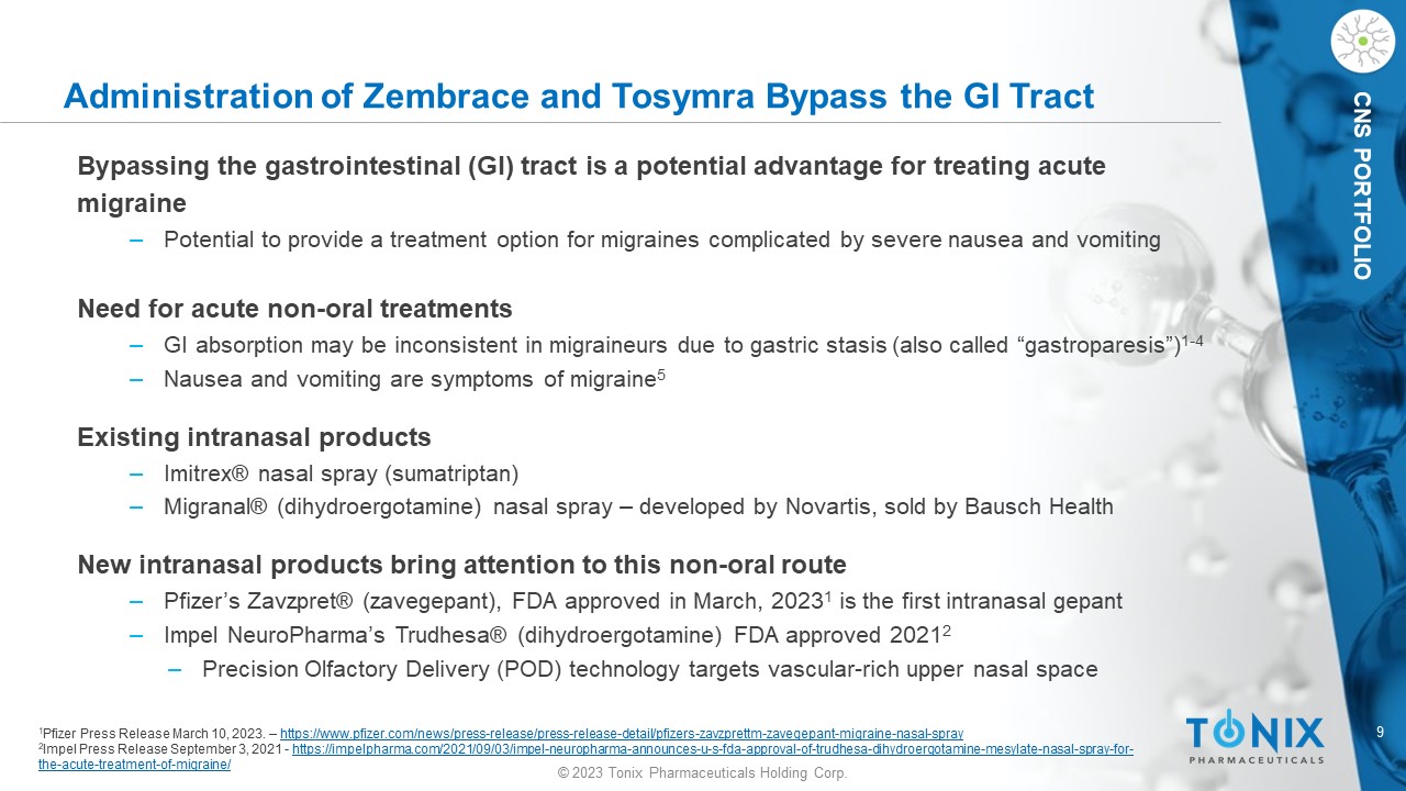 8 © 2023 Tonix Pharmaceuticals Holding Corp. CNS PORTFOLIO Tonix Medicines is our Commercial Subsidiary Marketed products for the treatment of acute migraine in adults with or without aura Zembrace ® SymTouch ® (sumatriptan injection) 3 mg 1 Tosymra ® (sumatriptan nasal spray) 10 mg 2 ‒ Both are proprietary non - oral formulations of sumatriptan that bypass the gastrointestinal tract Headed by President Jim Hunter ‒ Industry veteran – experience in CNS products ‒ Built Validus Pharmaceuticals Consolidated Product Sales for the 12 months ended March 31 st 2023 ‒ Factory sales: $30.4M 3 ‒ Net sales: $16.4M 3 Retail Product Sales for the 12 months ended December 31 st 2022 ‒ Retail sales: ~$23 M ( Zembrace ~$19.6 M and Tosymra ~$3.5 M) 4 Acquired from Upsher - Smith Laboratories which has managed care contracts covering ~200 M lives ‒ Contract includes a transition period during which Tonix expects to secure its own contracts 1 Zembrace SymTouch [package insert] . Maple Grove, MN : Upsher - Smith Laboratories, LLC : February 2021 - For more information, talk to your provider and read the Patient Information and Instructions for Use . – Important Safety Information is provided in the appendix 2 Tosymra [package insert]. Maple Grove, MN: Upsher - Smith Laboratories, LLC: Feb 2021 . For more information, talk to your provider and read the Patient Information and Instructions for Use . – Important Safety Information is provided in the appendix 3 Audited abbreviated financial statements of assets acquired from Upsher - Smith Laboratories, LLC as filed in the 8 - K/A dated July 18, 2023 https://ir.tonixpharma.com/sec - filings/all - sec - filings/content/0001387131 - 23 - 008497/0001387131 - 23 - 008497.pdf 4 IQVIA, 2022 sales from the National Sales Perspectives (NSP) audit within the SMART database estimates Zembrace sales of ~$19.6 M and Tosymra sales of ~$3.5 M