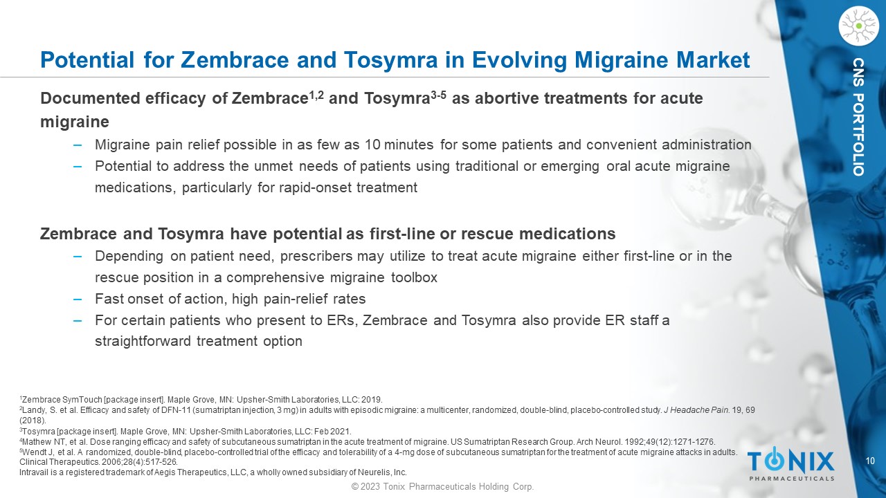 9 © 2023 Tonix Pharmaceuticals Holding Corp. CNS PORTFOLIO Administration of Zembrace and Tosymra Bypass the GI Tract Bypassing the gastrointestinal (GI) tract is a potential advantage for treating acute migraine ‒ P otential to provide a treatment option for migraines complicated by severe nausea and vomiting Need for acute non - oral treatments ‒ GI absorption may be inconsistent in migraineurs due to gastric stasis (also called “gastroparesis”) 1 - 4 ‒ Nausea and vomiting are symptoms of migraine 5 Existing intranasal products ‒ Imitrex® nasal spray (sumatriptan) ‒ Migranal ® (dihydroergotamine) nasal spray – developed by Novartis, sold by Bausch Health New intranasal products bring attention to this non - oral route ‒ Pfizer’s Zavzpret ® ( zavegepant ), FDA approved in March, 2023 1 is the first intranasal gepant ‒ Impel NeuroPharma’s Trudhesa ® (dihydroergotamine) FDA approved 2021 2 ‒ Precision Olfactory Delivery (POD) technology targets vascular - rich upper nasal space 1 Pfizer Press Release March 10, 2023. – https://www.pfizer.com/news/press - release/press - release - detail/pfizers - zavzprettm - zavegepant - migraine - nasal - spray 2 Impel Press Release September 3, 2021 - https://impelpharma.com/2021/09/03/impel - neuropharma - announces - u - s - fda - approval - of - trudhesa - dihydroergotamine - mesylate - nasal - spr ay - for - the - acute - treatment - of - migraine/