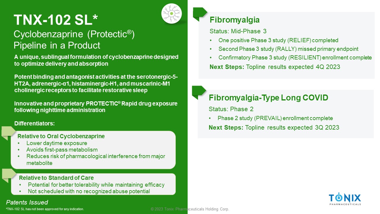 © 2023 Tonix Pharmaceuticals Holding Corp. TNX - 102 SL* Cyclobenzaprine ( Protectic ® ) Pipeline in a Product Fibromyalgia Status: Mid - Phase 3 • One positive Phase 3 study (RELIEF) completed • Second Phase 3 study (RALLY) missed primary endpoint • Confirmatory Phase 3 study (RESILIENT) enrollment complete Next Steps: Topline results expected 4Q 2023 Fibromyalgia - Type Long COVID Status: Phase 2 • Phase 2 study (PREVAIL) enrollment complete Next Steps: Topline results expected 3Q 2023 Patents Issued *TNX - 102 SL has not been approved for any indication. A unique, sublingual formulation of cyclobenzaprine designed to optimize delivery and absorption Potent binding and antagonist activities at the serotonergic - 5 - HT2A, adrenergic - α1, histaminergic - H1, and muscarinic - M1 cholinergic receptors to facilitate restorative sleep Innovative and proprietary PROTECTIC ® Rapid drug exposure following nighttime administration Differentiators: Relative to Oral Cyclobenzaprine • Lower daytime exposure • Avoids first - pass metabolism • Reduces risk of pharmacological interference from major metabolite Relative to Standard of Care • Potential for better tolerability while maintaining efficacy • Not scheduled with no recognized abuse potential