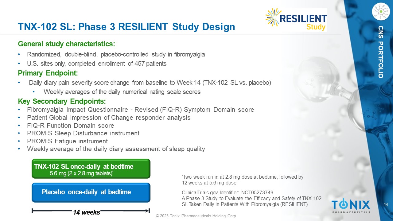 13 © 2023 Tonix Pharmaceuticals Holding Corp. CNS PORTFOLIO PROFILE DEVELOPMENT PROGRAM Patents Issued TNX - 102 SL*: Fibromyalgia Cyclobenzaprine Protectic ® Sublingual Tablets CNS PORTFOLIO Fibromyalgia (FM) is a chronic pain disorder resulting from amplified sensory and pain signaling within the CNS • A fflicts an estimated 6 - 12 million adults in the U.S., approximately 90% of whom are women 1 • Symptoms include chronic widespread pain, nonrestorative sleep, fatigue, and cognitive dysfunction • Patients struggle with daily activities, have impaired quality of life, and frequently are disabled • Physicians and patients report common dissatisfaction with currently marketed products Market Entry: Fibromyalgia Additional Indications: Long COVID, PTSD, Agitation in Alzheimer’s, Alcohol Use Disorder Status: One Positive Phase 3 study RELIEF completed 2 Second Phase 3 study RALLY missed primary endpoint Confirmatory Phase 3 study RESILIENT enrollment complete Next Steps: Topline results expected 4Q 2023 *TNX - 102 SL has not been approved for any indication. 1 American Chronic Pain Association (www.theacpa.org, 2019) 2 Lederman et al., (2023) Arthritis Care & Research "Efficacy and Safety of TNX - 102 SL (Sublingual Cyclobenzaprine) for the Treatment of Fibromyalgia: Results From the RELIEF Trial ", doi : 10.1002/acr.25142. Epub ahead of print. PMID: 37165930. When the check engine light malfunctions, the light is on even though the car is not malfunctioning