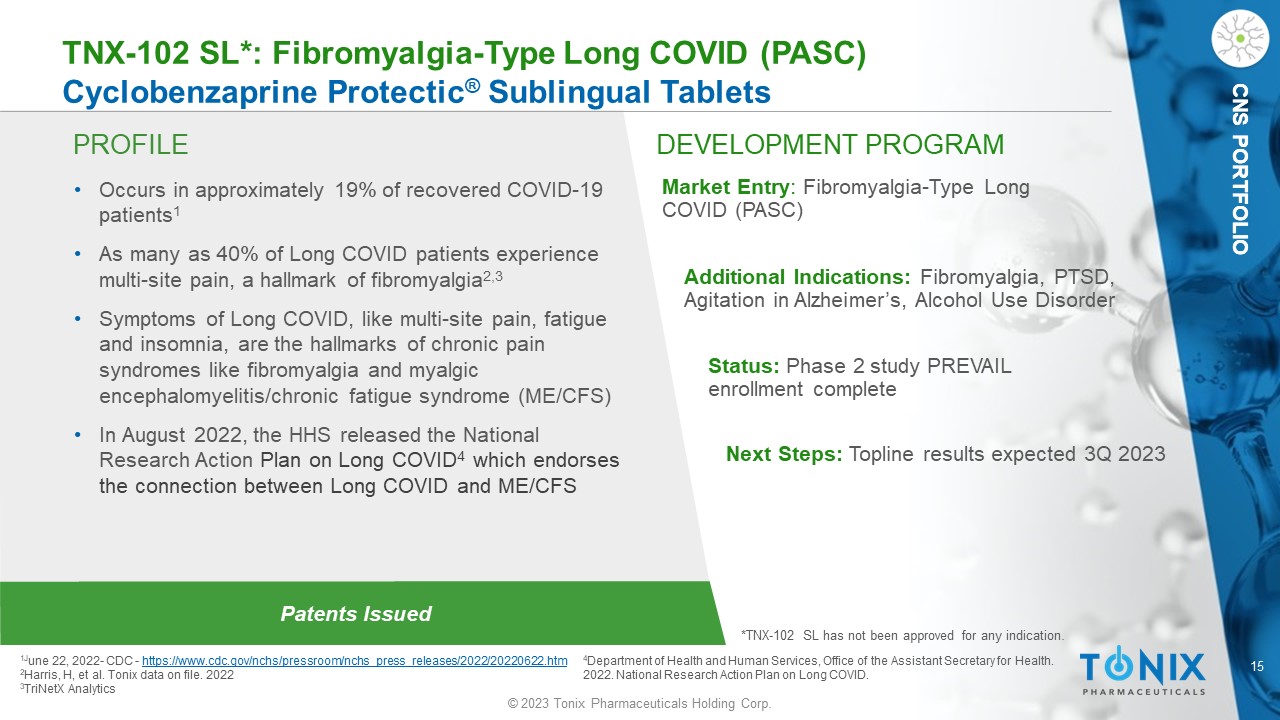 14 © 2023 Tonix Pharmaceuticals Holding Corp. CNS PORTFOLIO TNX - 102 SL: Phase 3 R ESILIENT Study Design General s tudy c haracteristics: • Randomized, double - blind, placebo - controlle d study in fibromyalgia • U.S. sites only, completed enrollment of 457 patients Primary Endpoint: • Daily diary pain severity score change from baseline to Week 14 (TNX - 102 SL vs. placebo) • Weekly averages of the daily numerical rating scale scores Key Secondary Endpoints: • Fibromyalgia Impact Questionnaire - Revised (FIQ - R) Symptom Domain score • Patient Global Impression of Change responder analysis • FIQ - R Function Domain score • PROMIS Sleep Disturbance instrument • PROMIS Fatigue instrument • Weekly average of the daily diary assessment of sleep quality Placebo once - daily at bedtime 14 weeks TNX - 102 SL once - daily at bedtime 5.6 mg (2 x 2.8 mg tablets) * * Two week run in at 2.8 mg dose at bedtime, followed by 12 weeks at 5.6 mg dose ClinicalTrials.gov Identifier: NCT05273749 A Phase 3 Study to Evaluate the Efficacy and Safety of TNX - 102 SL Taken Daily in Patients With Fibromyalgia (RESILIENT)