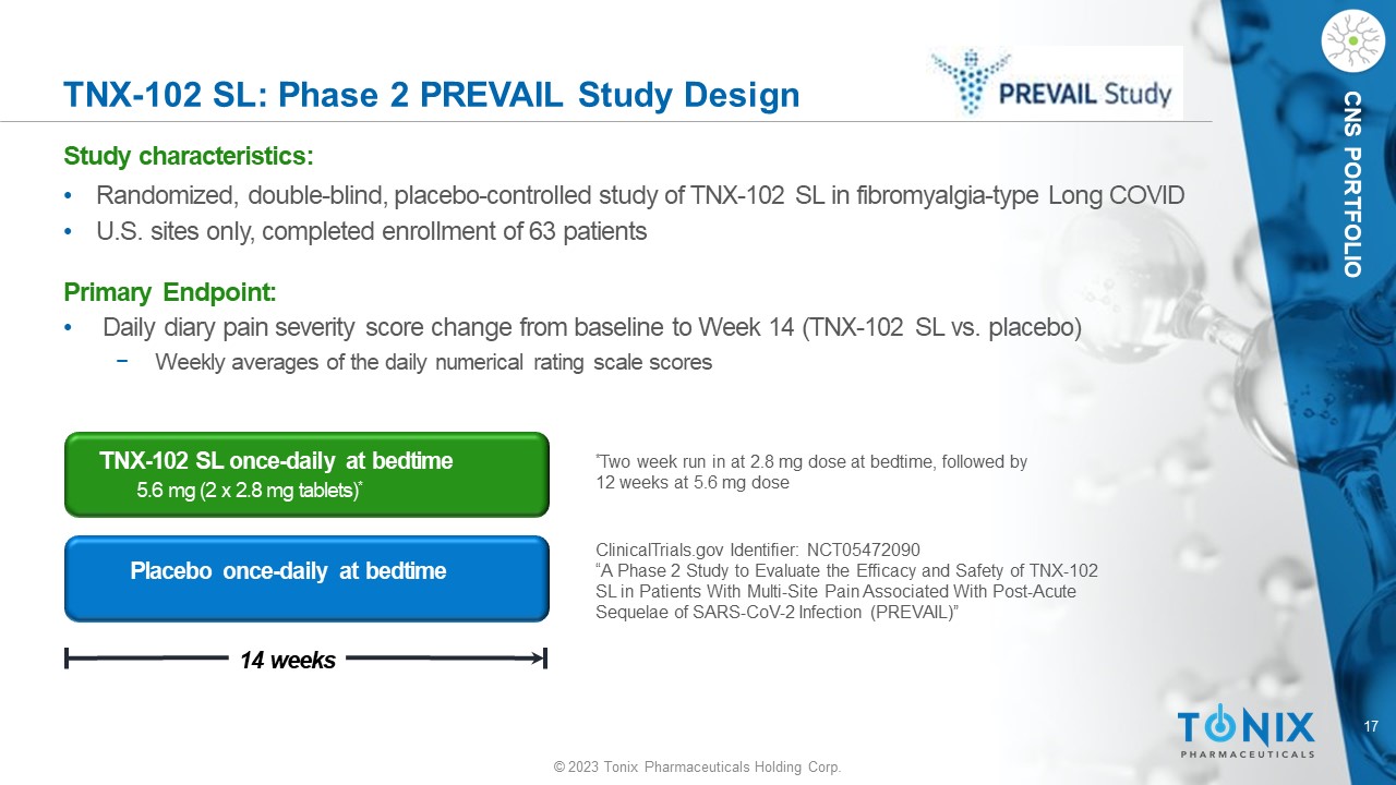 16 © 2023 Tonix Pharmaceuticals Holding Corp. CNS PORTFOLIO Fibromyalgia - Type Long COVID • Long COVID is a heterogeneous condition that displays elements of nociplastic pain in many individuals, who experience otherwise unexplained symptoms 1 - 3 Symptoms (multi - site pain, fatigue, sleep disorders and cognitive dysfunction) overlap with the key symptoms of fibromyalgia Multisite pain Memory issues Fatigue Sleep disturbances 1 Bierle et al., 2021. J Prim Care Community Health. 12:21501327211030826 2 Moghimi et al., 2021. Curr Neurol Neurosci Rep . 21(9):44 3 Thaweethai T, et al. 2023. JAMA. 2023 329(22):1934 - 1946 4 Trouvin et al., 2019. Best Pract Res Clin Rheumatol . 33(3):101415 Nociceptive pain Nociplastic pain Neuropathic pain Nociplastic pain 4 : ( new term for “Central and Peripheral Sensitization”) Pain that arises from altered nociception despite no clear evidence of tissue damage, or for disease or lesion of the somatosensory system causing the pain Central and Peripheral Sensitization