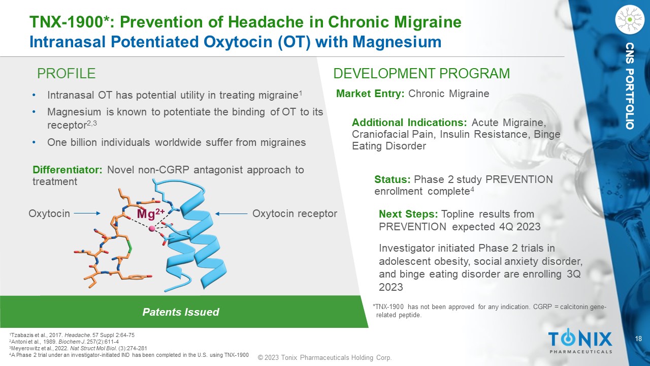 17 © 2023 Tonix Pharmaceuticals Holding Corp. CNS PORTFOLIO TNX - 102 SL: Phase 2 PREVAIL Study Design Study c haracteristics: • Randomized, double - blind, placebo - controlle d study of TNX - 102 SL in fibromyalgia - type Long COVID • U.S. sites only, completed enrollment of 63 patients Primary Endpoint: • Daily diary pain severity score change from baseline to Week 14 (TNX - 102 SL vs. placebo) − Weekly averages of the daily numerical rating scale scores Placebo once - daily at bedtime 14 weeks TNX - 102 SL once - daily at bedtime 5.6 mg (2 x 2.8 mg tablets) * * Two week run in at 2.8 mg dose at bedtime, followed by 12 weeks at 5.6 mg dose ClinicalTrials.gov Identifier: NCT05472090 “A Phase 2 Study to Evaluate the Efficacy and Safety of TNX - 102 SL in Patients With Multi - Site Pain Associated With Post - Acute Sequelae of SARS - CoV - 2 Infection (PREVAIL)”
