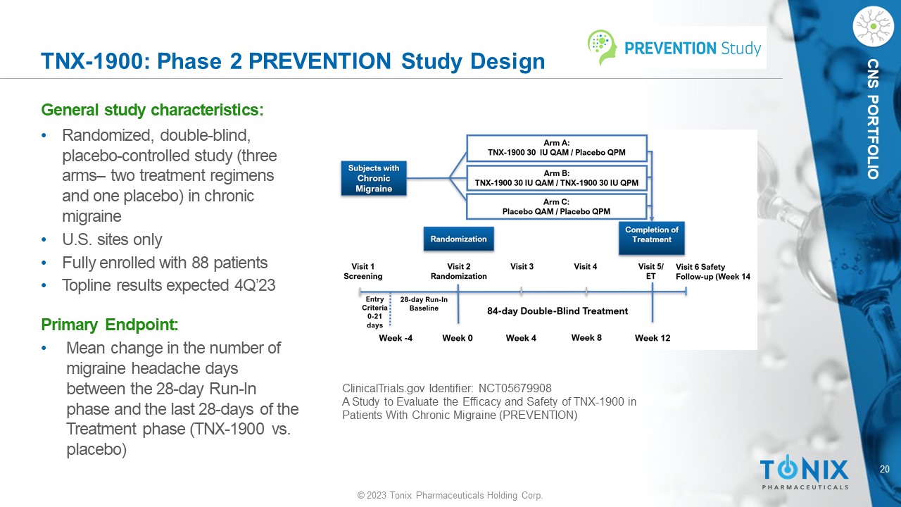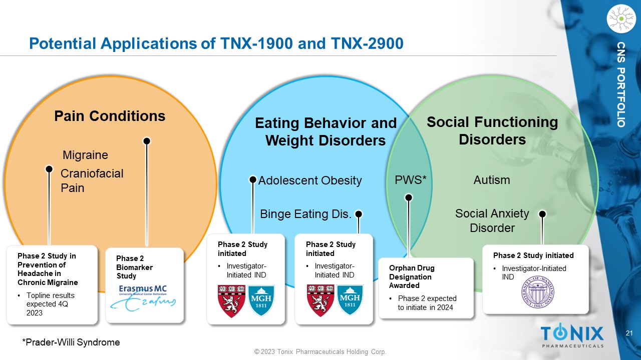 20 © 2023 Tonix Pharmaceuticals Holding Corp. CNS PORTFOLIO TNX - 1900: Phase 2 PREVENTION Study Design General s tudy c haracteristics: • Randomized, double - blind, placebo - controlle d study (three arms – two treatment regimens and one placebo) in chronic migraine • U.S. sites only • Fully enrolled with 88 patients • Topline results expected 4Q’23 Primary Endpoint: • M ean change in the number of migraine headache days between the 28 - day Run - In phase and the last 28 - days of the Treatment phase (TNX - 1900 vs. placebo) ClinicalTrials.gov Identifier: NCT05679908 A Study to Evaluate the Efficacy and Safety of TNX - 1900 in Patients With Chronic Migraine (PREVENTION) N = 50 N = 50 N = 50