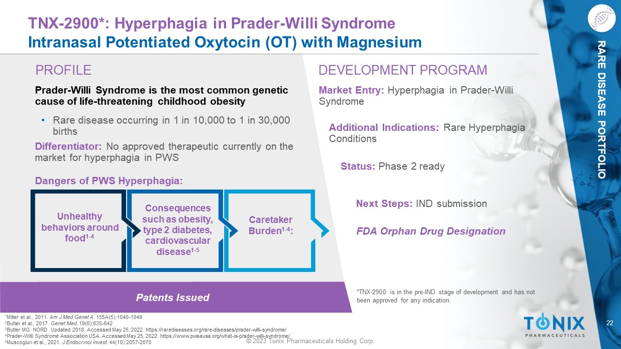 22 © 2023 Tonix Pharmaceuticals Holding Corp. RARE DISEASE PORTFOLIO Patents Issued PROFILE DEVELOPMENT PROGRAM TNX - 2900*: Hyperphagia in Prader - Willi Syndrome Intranasal Potentiated Oxytocin (OT) with Magnesium Prader - Willi Syndrome is the most common genetic cause of life - threatening childhood obesity • Rare disease occurring in 1 in 10,000 to 1 in 30,000 births Differentiator: No approved therapeutic currently on the market for hyperphagia in PWS Dangers of PWS Hyperphagia: Market Entry: Hyperphagia in Prader - Willi Syndrome Additional Indications: Rare Hyperphagia Conditions Status: Phase 2 ready Next Steps: IND submission *TNX - 2900 is in the pre - IND stage of development and has not been approved for any indication. Caretaker Burden 1 - 4 : Unhealthy behaviors around food 1 - 4 Consequences such as obesity, type 2 diabetes, cardiovascular disease 1 - 5 1 Miller et al., 2011. Am J Med Genet A . 1 55A(5):1040 - 1049 2 Butler et al., 2017. Genet Med. 19(6):635 - 642 3 Butler MG. NORD. Updated 2018. Accessed May 25, 2022. https://rarediseases.org/rare - diseases/prader - willi - syndrome/ 4 Prader - Willi Syndrome Association USA. Accessed May 25, 2022. https://www.pwsausa.org/what - is - prader - willi - syndrome/ 5 Muscogiuri et al., 2021. J Endocrinol Invest . 44(10):2057 - 2070 FDA Orphan Drug Designation