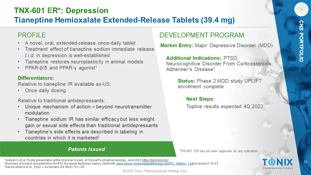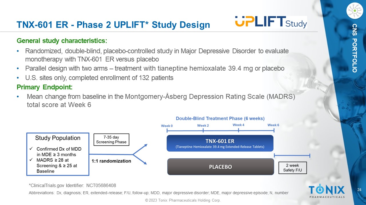 23 © 2023 Tonix Pharmaceuticals Holding Corp. CNS PORTFOLIO PROFILE DEVELOPMENT PROGRAM Patents Issued TNX - 601 E R*: Depression Tianeptine Hemioxalate Extended - Release Tablets (39.4 mg) CNS PORTFOLIO • A novel, oral, extended - release once - daily tablet • Treatment effect of tianeptine sodium immediate release t.i.d. in depression is well - established • Tianeptine restores neuroplasticity in animal models • PPAR - β / δ and PPAR - γ agonist 1 Differentiators: Relative to tianeptine IR available ex - US: • Once daily dosing Relative to traditional antidepressants: • Unique mechanism of action – beyond neurotransmitter modulation • Tianeptine sodium IR has similar efficacy but less weight gain or sexual side effects than traditional antidepressants • Tianeptine’s side effects are described in labeling in countries in which it is marketed 2 Market Entry: Major Depressive Disorder (MDD) Additional Indications: PTSD, Neurocognitive Disorder From Corticosteroids, Alzheimer’s Disease 3 Status: Phase 2 MDD study UPLIFT enrollment complete Next Steps: Topline results expected 4Q 2023 1 Sullivan G et al. Poster presentation at the American Society of Clinical Psychopharmacology, June 2023. https://bit.ly/42o3jnV 2 Su mmary of product characteristics ( SmPC), European Medicines Agency, Stablon ®, www.servier.ci/sites/default/files/spc - pil/SPC_Stablon_1.pdf accessed 7 - 16 - 23. 3 García - Alberca et al., 2022. J Alzheimers Dis . 88(2):707 - 720 *TNX - 601 ER has not been approved for any indication.
