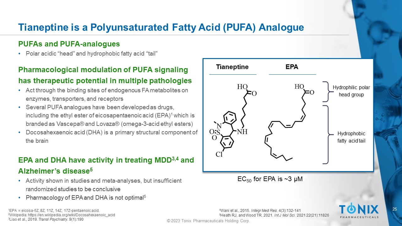 25 © 2023 Tonix Pharmaceuticals Holding Corp. Tianeptine is a Polyunsaturated Fatty Acid (PUFA) Analogue PUFAs and PUFA - analogues • Polar acidic “head” and hydrophobic fatty acid “tail” Pharmacological modulation of PUFA signaling has therapeutic potential in multiple pathologies • Act through the binding sites of endogenous FA metabolites on enzymes, transporters, and receptors • Several PUFA analogues have been developed as drugs, including the ethyl ester of eicosapentaenoic acid (EPA) 1 which is branded as Vascepa ® and Lovaza ® (omega - 3 - acid ethyl esters) • Docosahexaenoic acid (DHA) is a primary structural component of the brain EPA and DHA have activity in treating MDD 3,4 and Alzheimer’s disease 5 • Activity shown in studies and meta - analyses, but insufficient randomized studies to be conclusive • Pharmacology of EPA and DHA is not optimal 5 EPA Hydrophilic polar head group Hydrophobic fatty acid tail 1 EPA = e icosa - 5Z, 8Z, 11Z, 14Z, 17Z - pentaenoic acid. 2 Wikipedia: https://en.wikipedia.org/wiki/Docosahexaenoic_acid 3 Liao et al ., 2019. Transl Psychiatry . 9(1):190 Tianeptine EC 50 for EPA is ~3 µM 4 Wani et al., 2015. Integr Med Res . 4(3):132 - 141 5 Heath RJ, and Wood TR. 2021. Int J Mol Sci. 2021 22(21):11826