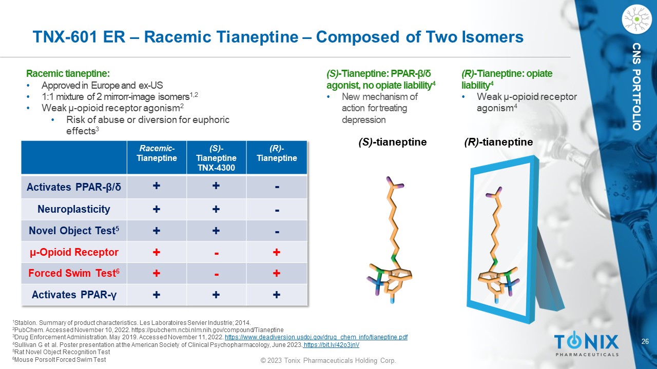 26 © 2023 Tonix Pharmaceuticals Holding Corp. CNS PORTFOLIO TNX - 601 ER – Racemic Tianeptine – Composed of Two Isomers Racemic tianeptine : • Approved in Europe and ex - US • 1:1 mixture of 2 mirror r - image isomers 1,2 • Weak µ - o pioid receptor agonism 2 • Risk of abuse or diversion for euphoric effects 3 (S) - t ianeptine (R) - tianeptine 1 Stablon. Summary of product characteristics. Les Laboratoires Servier Industrie ; 2014. 2 PubChem. Accessed November 10, 2022. https://pubchem.ncbi.nlm.nih.gov/compound/Tianeptine 3 Drug Enforcement Administration. May 2019. Accessed November 11, 2022 . https://www.deadiversion.usdoj.gov/drug_chem_info/tianeptine.pdf 4 Sullivan G et al. Poster presentation at the American Society of Clinical Psychopharmacology, June 2023 . https://bit.ly/42o3jnV 5 Rat Novel Object Recognition Test 6 Mouse Porsolt Forced Swim Test Racemic - Tianeptine (S) - Tianeptine TNX - 4300 (R) - Tianeptine Activates PPAR - β / δ + + - Neuroplasticity + + - Novel Object Test 5 + + - µ - Opioid Receptor + - + Forced Swim Test 6 + - + Activates PPAR - γ + + + (S) - Tianeptine: PPAR - β / δ agonist, no opiate liability 4 • New mechanism of action for treating depression (R) - Tianeptine: opiate liability 4 • Weak µ - o pioid receptor agonism 4