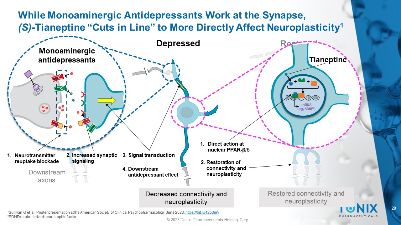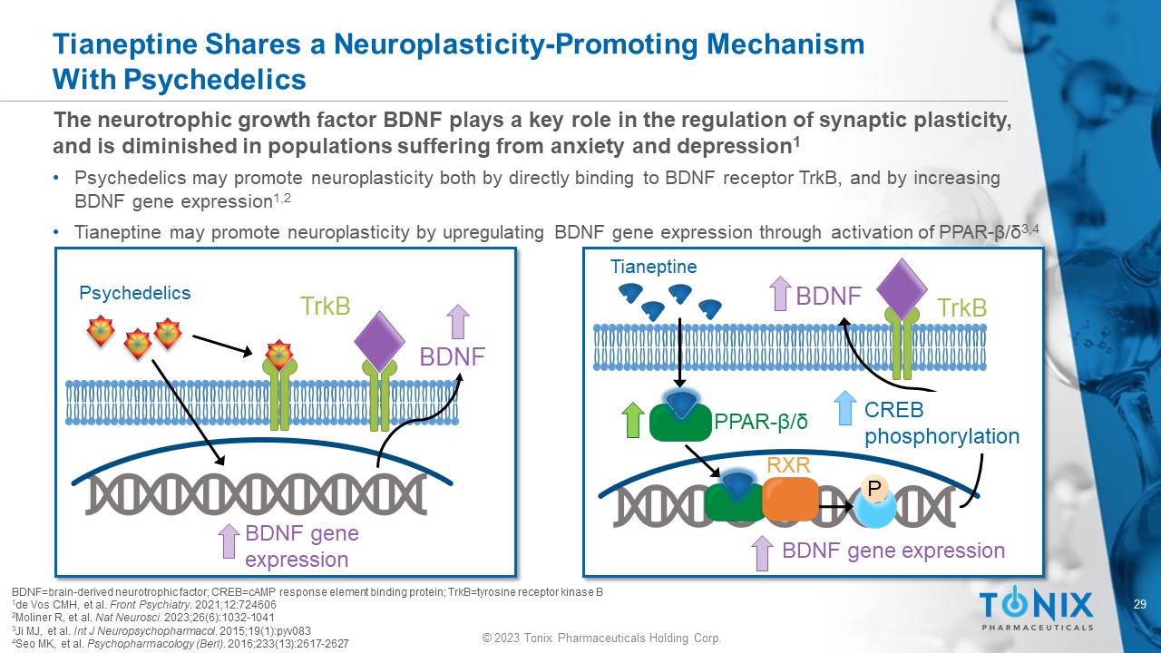28 © 2023 Tonix Pharmaceuticals Holding Corp. While Monoaminergic Antidepressants Work at the Synapse, (S) - Tianeptine “Cuts in Line” to More Directly Affect Neuroplasticity 1 Depressed Decreased connectivity and neuroplasticity Tianeptine + + mRNA ( eg , BDNF 2 ) 1 Sullivan G et al. Poster presentation at the American Society of Clinical Psychopharmacology, June 2023. https://bit.ly/42o3jnV 2 BDNF=brain - derived neurotrophic factor. Monoaminergic antidepressants 1. Neurotransmitter reuptake blockade 1. Direct action at nuclear PPAR - β/δ 2. Increased synaptic signaling 3. Signal transduction 4. Downstream antidepressant effect 2. Restoration of connectivity and neuroplasticity