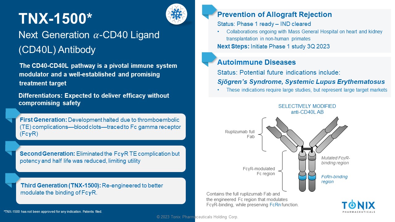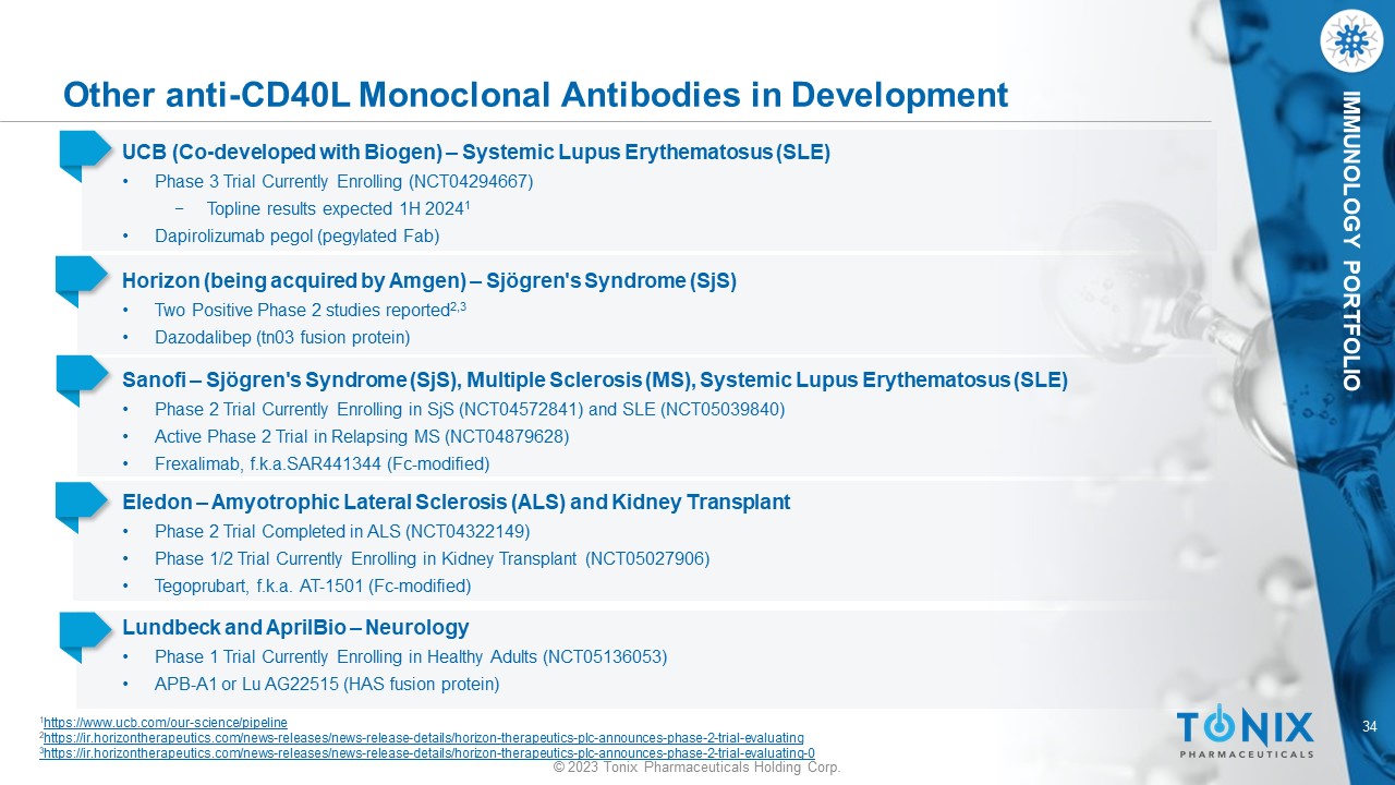 33 © 2023 Tonix Pharmaceuticals Holding Corp. IMMUNOLOGY PORTFOLIO Third - Generation α - CD40L Engineered to Decrease Risk of Thrombosis First - generation anti - CD40L mAbs Constant fragment (Fc) domain interacted with FcγRIIA (CD32A), which suggested a mechanism for the increased risk of thrombosis. 1,2 Ruplizumab Second - generation anti - CD40L proteins Second - generation anti - CD40L proteins exhibited dramatically reduced binding to FcγRIIA 3 - 6 but had other issues, including decreased efficacy, shortened half - life, or engendering of anti - drug antibodies (ADAs). 7 - 9 Dapirolizumab Letolizumab Aglycosyl Ruplizumab Third - generation anti - CD40L mAbs * TNX - 1500 is engineered to target CD40L therapeutically while reducing FcγRIIA binding and thereby lowering the potential for thrombosis. 1 - 9 TNX - 1500 *Sanofi’s frexalimab (formerly SAR441344) and Eledon’s tegoprubart (formerly AT - 1501) also are Fc modified 1 Inwald et al., 2003. Circ Res . 92(9):1041 - 1048 2 Robles - Carrillo et al., 2010. J Immunol . 185(3):1577 - 1583 3 Shock et al., 2015. Arthritis Res Ther . 17(1):234 4 Xie et al., 2014. J Immunol . 192(9):4083 - 4092 5 Ferrant et al., 2004. Int Immunol . 16(11):1583 - 1594 6 Karnell et al., 2019. Sci Transl Med. 11(489):eaar6584 7 ClinicalTrials.gov identifier: NCT02273960. Updated July 16, 2019. Accessed June 1, 2021. https://clinicaltrials.gov/ct2/show /re sults/NCT02273960?view=results 8 Waters, 2018. Biocentury . 9 Company data Dazodalibep