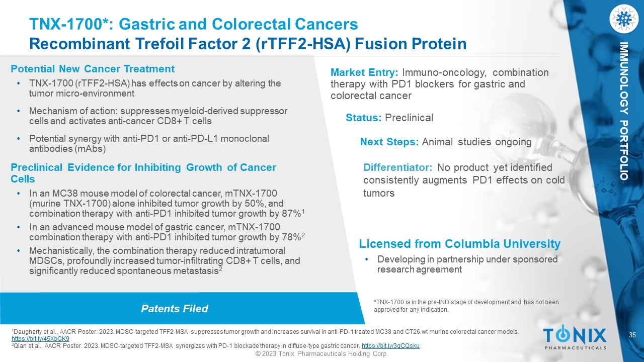 35 © 2023 Tonix Pharmaceuticals Holding Corp. IMMUNOLOGY PORTFOLIO Patents Filed TNX - 1700*: Gastric and Colorectal Cancers Recombinant Trefoil Factor 2 (rTFF2 - HSA) Fusion Protein Potential New Cancer Treatment • TNX - 1700 (rTFF2 - HSA) has effects on cancer by altering the tumor micro - environment • Mechanism of action: suppresses myeloid - derived suppressor cells and activates anti - cancer CD8+ T cells • Potential synergy with anti - PD1 or anti - PD - L1 monoclonal antibodies ( mAbs ) Preclinical Evidence for Inhibiting Growth of Cancer Cells • In an MC38 mouse model of colorectal cancer, mTNX - 1700 (murine TNX - 1700) alone inhibited tumor growth by 50%, and combination therapy with anti - PD1 inhibited tumor growth by 87% 1 • In an advanced mouse model of gastric cancer, mTNX - 1700 combination therapy with anti - PD1 inhibited tumor growth by 78% 2 • Mechanistically, the combination therapy reduced intratumoral MDSCs, profoundly increased tumor - infiltrating CD8+ T cells, and significantly reduced spontaneous metastasis 2 Market Entry: Immuno - oncology, combination therapy with PD1 blockers for gastric and colorectal cancer Status: Preclinical Next Steps: Animal studies ongoing *TNX - 1700 is in the pre - IND stage of development and has not been approved for any indication. Differentiator: No product yet identified consistently augments PD1 effects on cold tumors Licensed from Columbia University • Developing in partnership under sponsored research agreement 1 Daugherty et al., AACR Poster. 2023. MDSC - targeted TFF2 - MSA suppresses tumor growth and increases survival in anti - PD - 1 treated MC38 and CT26.wt murine colorectal cancer models. https://bit.ly/45XbGK9 2 Qian et al., AACR Poster. 2023. MDSC - targeted TFF2 - MSA synergizes with PD - 1 blockade therapy in diffuse - type gastric cancer. https://bit.ly/3qCQsku