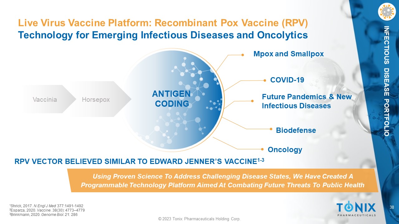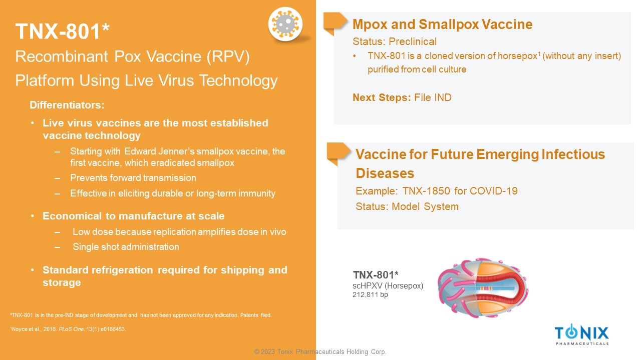 © 2023 Tonix Pharmaceuticals Holding Corp. TNX - 801* Recombinant Pox Vaccine (RPV) Platform Using Live Virus Technology Mpox and Smallpox Vaccine Status: Preclinical • TNX - 801 is a cloned version of horsepox 1 (without any insert) purified from cell culture Next Steps: File IND Vaccine for Future Emerging Infectious Diseases Example: TNX - 1850 for COVID - 19 Status: Model System *TNX - 801 is in the pre - IND stage of development and has not been approved for any indication. Patents filed. • Live virus vaccines are the most established vaccine technology ‒ Starting with Edward Jenner’s smallpox vaccine, the first vaccine, which eradicated smallpox ‒ Prevents forward transmission ‒ Effective in eliciting durable or long - term immunity • Economical to manufacture at scale ‒ Low dose because replication amplifies dose in vivo ‒ Single shot administration • Standard refrigeration required for shipping and storage 1 Noyce et al., 2018. PLoS One . 13(1):e0188453. Differentiators: TNX - 801* scHPXV (Horsepox) 212,811 bp