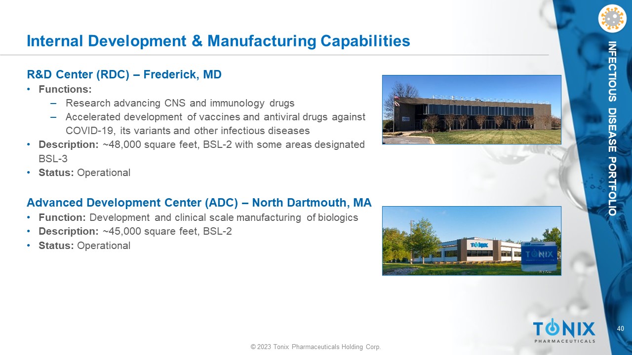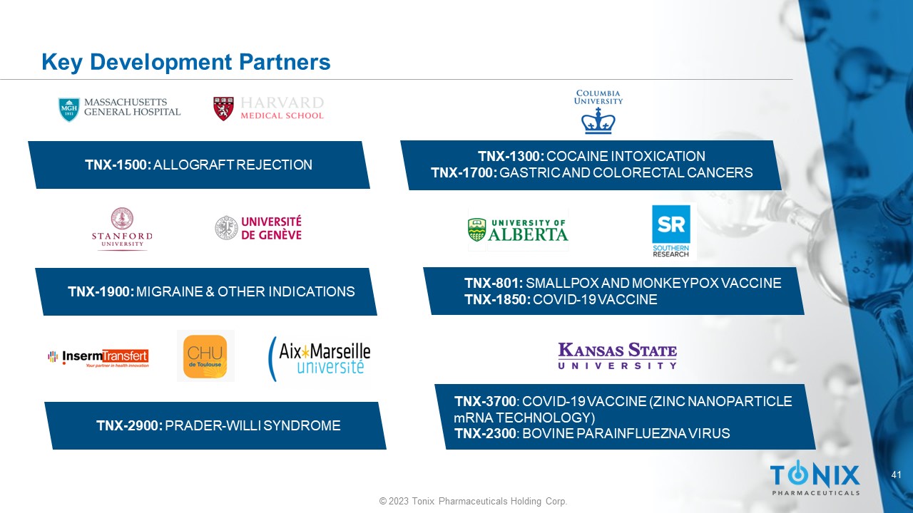 40 © 2023 Tonix Pharmaceuticals Holding Corp. INFECTIOUS DISEASE PORTFOLIO Internal Development & Manufacturing Capabilities R&D Center (RDC) – Frederick, MD • Functions: ‒ Research advancing CNS and immunology drugs ‒ Accelerated development of vaccines and antiviral drugs against COVID - 19, its variants and other infectious diseases • Description: ~48,000 square feet, BSL - 2 with some areas designated BSL - 3 • Status: Operational Advanced Development Center (ADC) – North Dartmouth, MA • Function: Development and clinical scale manufacturing of biologics • Description: ~45,000 square feet, BSL - 2 • Status: Operational