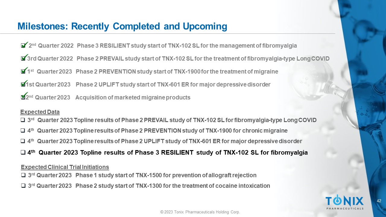 42 © 2023 Tonix Pharmaceuticals Holding Corp. Milestones: Recently Completed and Upcoming Expected Clinical Trial Initiations □ 3 rd Quarter 2023 Phase 1 study start of TNX - 1500 for prevention of allograft rejection □ 3 rd Quarter 2023 Phase 2 study start of TNX - 1300 for the treatment of cocaine intoxication □ 2 nd Quarter 2022 Phase 3 RESILIENT study start of TNX - 102 SL for the management of fibromyalgia □ 3rd Quarter 2022 Phase 2 PREVAIL study start of TNX - 102 SL for the treatment of fibromyalgia - type Long COVID □ 1 st Quarter 2023 Phase 2 PREVENTION study start of TNX - 1900 for the treatment of migraine □ 1st Quarter 2023 Phase 2 UPLIFT study start of TNX - 601 ER for major depressive disorder □ 2 nd Quarter 2023 Acquisition of marketed migraine products x x Expected Data □ 3 rd Quarter 2023 Topline results of Phase 2 PREVAIL study of TNX - 102 SL for fibromyalgia - type Long COVID □ 4 th Quarter 2023 Topline results of Phase 2 PREVENTION study of TNX - 1900 for chronic migraine □ 4 th Quarter 2023 Topline results of Phase 2 UPLIFT study of TNX - 601 ER for major depressive disorder □ 4 th Quarter 2023 Topline results of Phase 3 RESILIENT study of TNX - 102 SL for fibromyalgia x x x