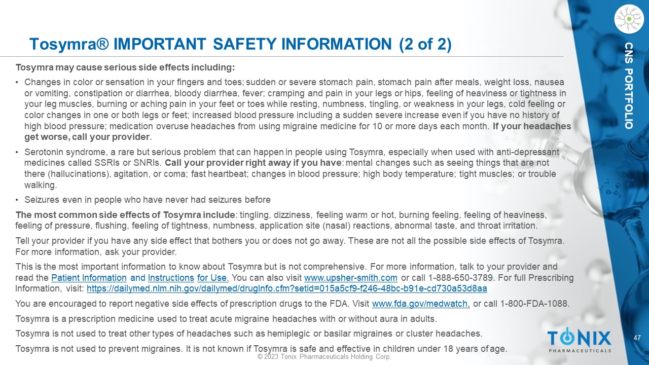 46 © 2023 Tonix Pharmaceuticals Holding Corp. CNS PORTFOLIO Tosymra® IMPORTANT SAFETY INFORMATION (1 of 2) Tosymra® can cause serious side effects, including heart attack and other heart problems, which may lead to death. Stop Tosymra and get emergency medical help if you have any signs of heart attack: • D iscomfort in the center of your chest that lasts for more than a few minutes or goes away and comes back ; severe tightness, pain, pressure, or heaviness in your chest, throat, neck, or jaw ; pain or discomfort in your arms, back, neck, jaw, or stomach ; shortness of breath with or without chest discomfort; breaking out in a cold sweat ; nausea or vomiting ; feeling lightheaded Tosymra is not for people with risk factors for heart disease (high blood pressure or cholesterol, smoking, overweight, diabetes, family history of heart disease) unless a heart exam is done and shows no problem. Do not use Tosymra if you have: • H istory of heart problems ; narrowing of blood vessels to your legs, arms, stomach, or kidney (peripheral vascular disease) ; uncontrolled high blood pressure ; severe liver problems ; hemiplegic or basilar migraines. If you are not sure if you have these, ask your healthcare provider. • H ad a stroke, transient ischemic attacks (TIAs), or problems with blood circulation ; taken any of the following medicines in the last 24 hours: almotriptan , eletriptan , frovatriptan , naratriptan, rizatriptan, ergotamines , or dihydroergotamine. Ask your provider if you are not sure if your medicine is listed above • are taking certain antidepressants, known as monoamine oxidase (MAO) - A inhibitors or it has been 2 weeks or less since you stopped taking a MAO - A inhibitor . A sk your provider for a list of these medicines if you are not sure • A n allergy to sumatriptan or any ingredient in Tosymra Tell your provider about all of your medical conditions and medicines you take, including vitamins and supplements. Tosymra can cause dizziness, weakness, or drowsiness. If so, do not drive a car, use machinery, or do anything where you need to be alert.
