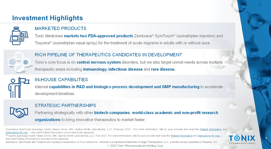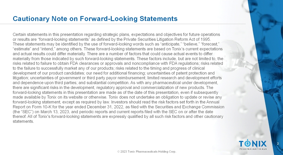 2 © 2023 Tonix Pharmaceuticals Holding Corp. Cautionary Note on Forward-Looking Statements Certain statements in this presentation regarding strategic plans, expectations and objectives for future operations or results are “forward-looking statements” as defined by the Private Securities Litigation Reform Act of 1995. These statements may be identified by the use of forward-looking words such as “anticipate,” “believe,” “forecast,” “estimate” and “intend,” among others. These forward-looking statements are based on Tonix’s current expectations and actual results could differ materially. There are a number of factors that could cause actual events to differ materially from those indicated by such forward-looking statements. These factors include, but are not limited to, the risks related to failure to obtain FDA clearances or approvals and noncompliance with FDA regulations; risks related to the failure to successfully market any of our products; risks related to the timing and progress of clinical development of our product candidates; our need for additional financing; uncertainties of patent protection and litigation; uncertainties of government or third party payor reimbursement; limited research and development efforts and dependence upon third parties; and substantial competition. As with any pharmaceutical under development, there are significant risks in the development, regulatory approval and commercialization of new products. The forward-looking statements in this presentation are made as of the date of this presentation, even if subsequently made available by Tonix on its website or otherwise. Tonix does not undertake an obligation to update or revise any forward-looking statement, except as required by law. Investors should read the risk factors set forth in the Annual Report on Form 10-K for the year ended December 31, 2022, as filed with the Securities and Exchange Commission (the “SEC”) on March 13, 2023, and periodic reports and current reports filed with the SEC on or after the date thereof. All of Tonix's forward-looking statements are expressly qualified by all such risk factors and other cautionary statements.